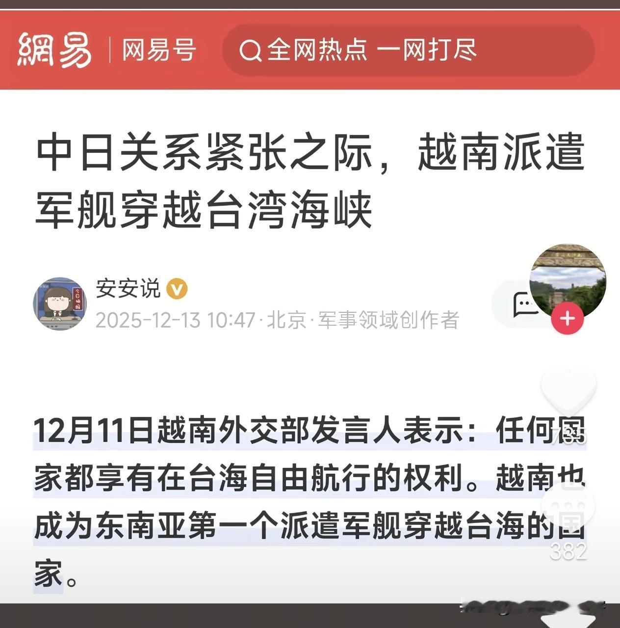台湾海峡作为重要的国际航道,越南派遣军舰穿越台海,这无疑开了一个极不好的先例。这就像是出现了一个“风口”,如果这个风口不及时堵住,后续很可能会有越来越多的国家效仿这种行为,纷纷以此进行试探,将会有更多“风口”出现。这不仅会严重破坏台海地区的稳定与秩序,还会让台海局势变得更加复杂和难以预测,甚至会对地区的和平安全构成巨大威胁,我们必须对此保持高度警惕,坚决维护国家主权和领土完整。