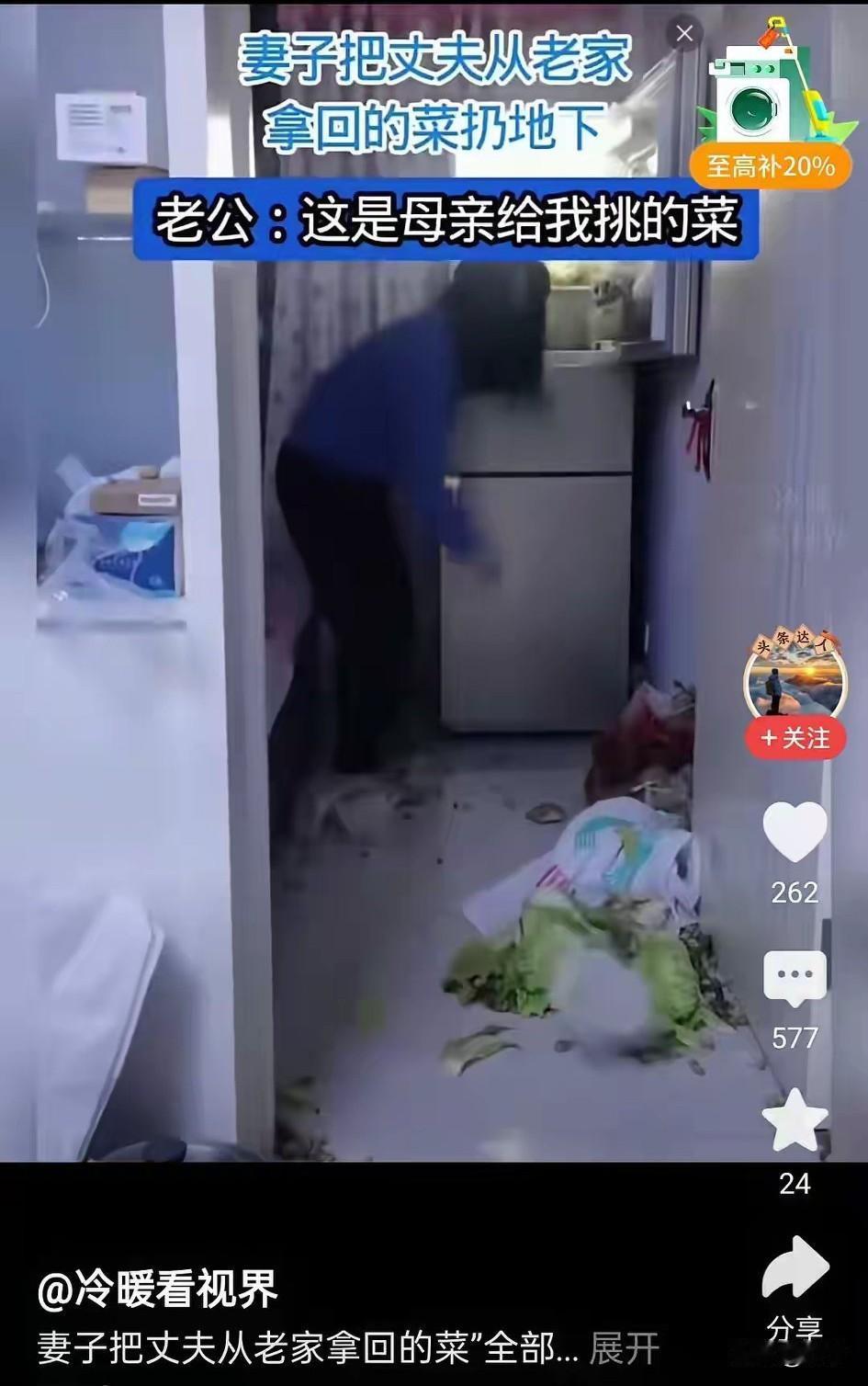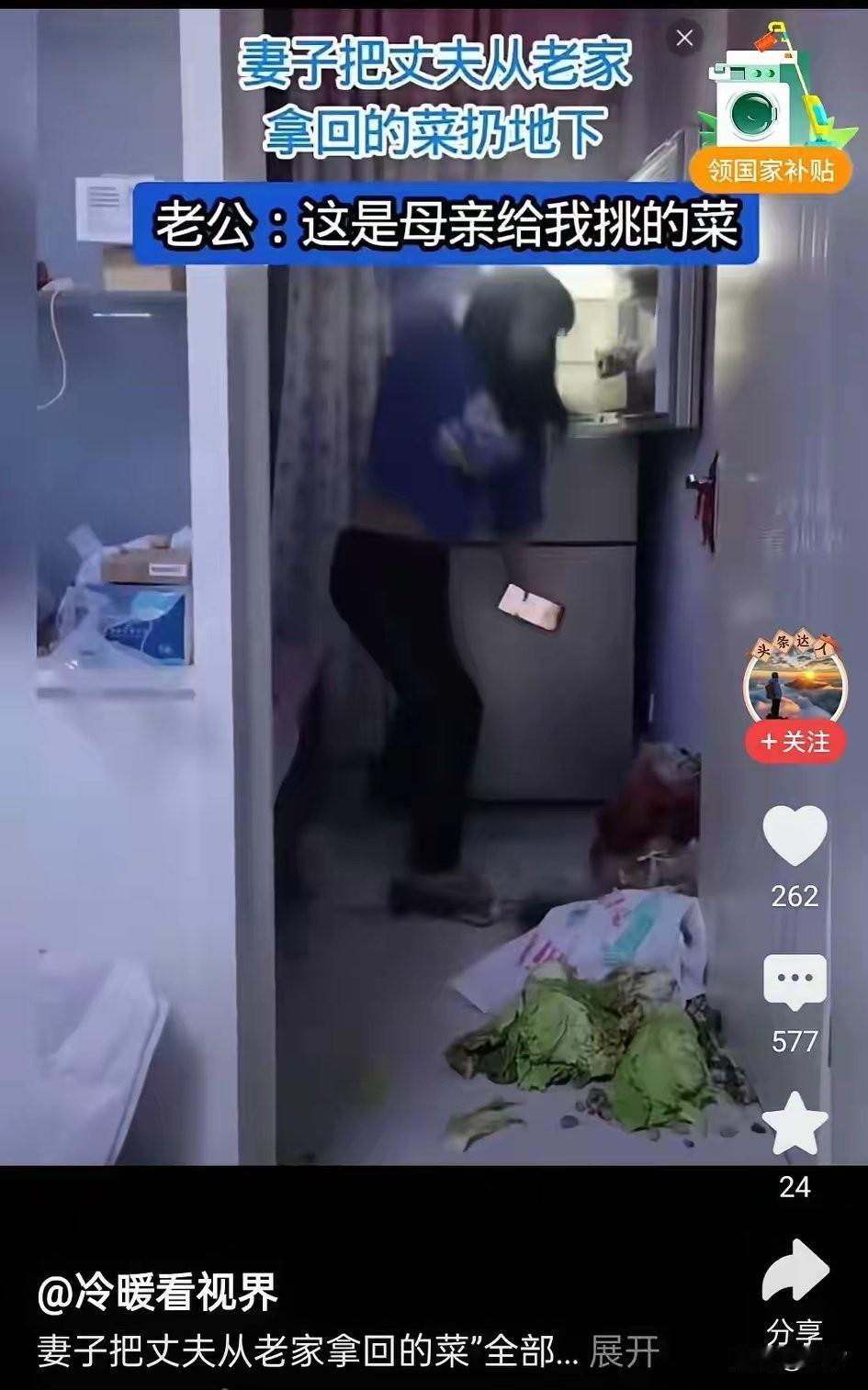 婆媳矛盾真是千年难题, 老公从农村老家带回来的菜, 妻子问从哪里买的, 男子表示是母亲让带来的, 自己家种的不要钱, 还比较健康, 妻子一听是婆婆让带的, 瞬间暴怒了, 直接将装着菜的袋子, 一把夺了过来, 然后狠狠扔在地上, 丈夫彻底发怒了, 就动手打了妻子, 妻子大喊道你个乡巴佬, 没有我家你能有房子住吗? 你还敢打我, 太没有良心了, 男子也被激怒了, 直接摔门出去了, 这样的家庭矛盾看来不可调和, 听到婆婆的名字就发疯了, 看来是和农村婆婆矛盾很大, 婚姻不是两个人的事情, 而是两个家庭的结合, 门当户对可是非常重要的, 大家对于丈夫从农村带回婆婆种的菜就惹的妻子大怒怎么看? 婆媳关系 婆媳 婆媳相处之道 婚姻婆媳相处 婆媳相处妙招 婆媳间事 婆媳纠纷