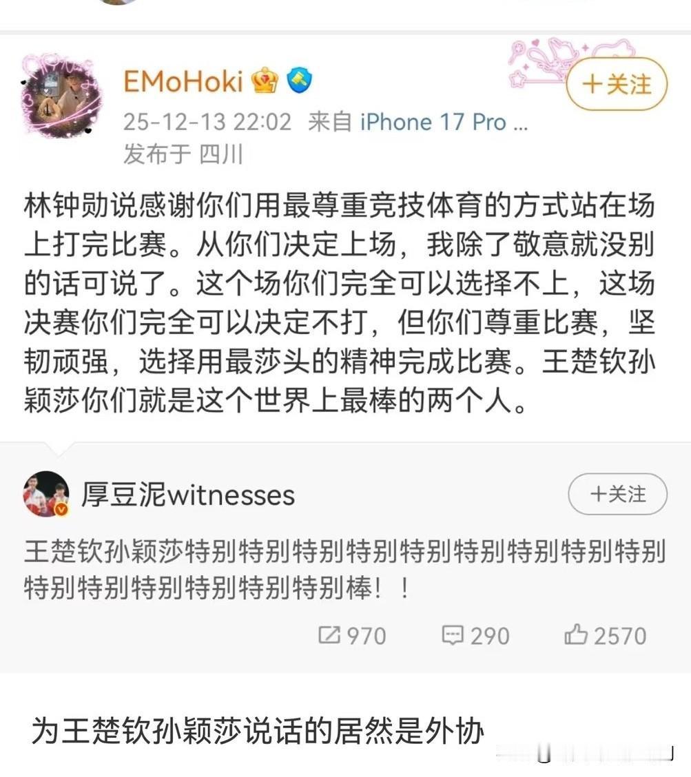 今晚看他俩没穿多哈战袍穿蓝色队服出来就明白了[流泪] 看到这身衣服就大概知道结局了,两个运动员太不易了! 建议看韩林采访!说了莎受伤了,楚钦打了很多场比赛很累! 其实莎头可以选择退的,但像韩林说了他们俩还是以专业的态度来完成了比赛! 尊重赛场,尊重对手,尊重观众,这就是他们带伤出战的高素养! 可是,有没有人能告诉莎头,我们真的好爱好爱他们! 不需要他们证明什么,不需要他们那么有责任感和素养! 他们在我心里已经是顶好顶好的存在,无人替代!!!