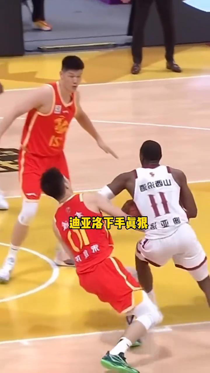 迪亚洛下手真狠,朱俊龙倒在地上。 迪亚洛肘击朱俊龙,明显的违体犯规,迪亚洛真的太脏了。