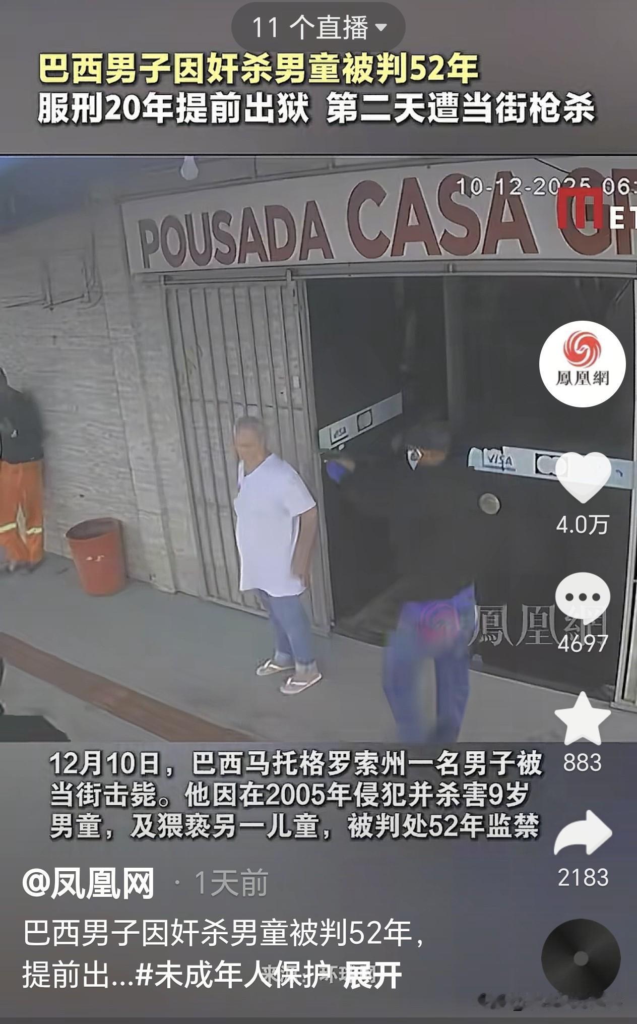 原谅他是上帝的事,人们要做的就是送他去见上帝。 12月10日,巴西有个男子,2005年的时候奸杀了一个9岁的男童,还猥亵了另一个儿童,被判了52年监禁。结果他服刑20年后就提前出狱了,谁能想到,出狱第二天,他就被黑衣人在街头枪杀了。 这就让人想起那句话,原谅他是上帝的事情,而人们要做的,就是送他去见上帝。这种人做了那么坏的事情,很多人都觉得他死有余辜,用这种方式结束,仿佛也是一种报应。不过这也引发了很多争议,有人觉得这是私刑,不太合适,但不管怎么说,他的结局也算是给那些被他伤害过的人一个交代了。