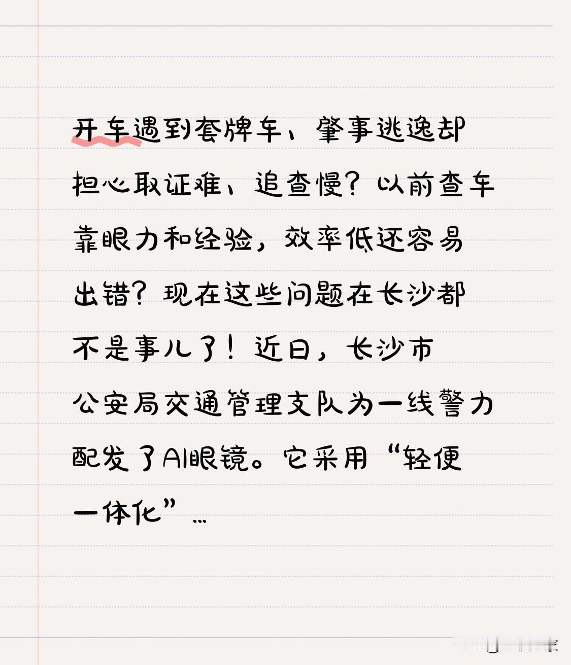 开车遇到套牌车、肇事逃逸却担心取证难、追查慢?以前查车靠眼力和经验,效率低还容易出错?现在这些问题在长沙都不是事儿了! 近日,长沙市公安局交通管理支队为一线警力配发了AI眼镜。它采用“轻便一体化”设计,搭载1200万超清广角摄像头,配备智能预测防抖算法。交警戴上它,手指轻按镜架按钮,1 - 2秒就能完成车牌信息比对,原本半小时的核查工作现在3秒搞定,拥堵路段执法效率直接翻倍。而且它还能人脸识别、实时语音翻译,外地游客迷路、外国友人问路都能轻松解决。一线交警也不用再带一堆设备,一副眼镜全搞定。 有了这“黑科技”,大家是不是对长沙的交通秩序更有信心了?你觉得AI眼镜还能在哪些方面发挥作用呢? 套牌车辆违章 车辆套牌 车牌查违章 套牌车辆违章 车辆套牌 套牌鉴定证书 交警查车特效 长沙开车违章 杭州套牌车 深圳套牌车鉴定
