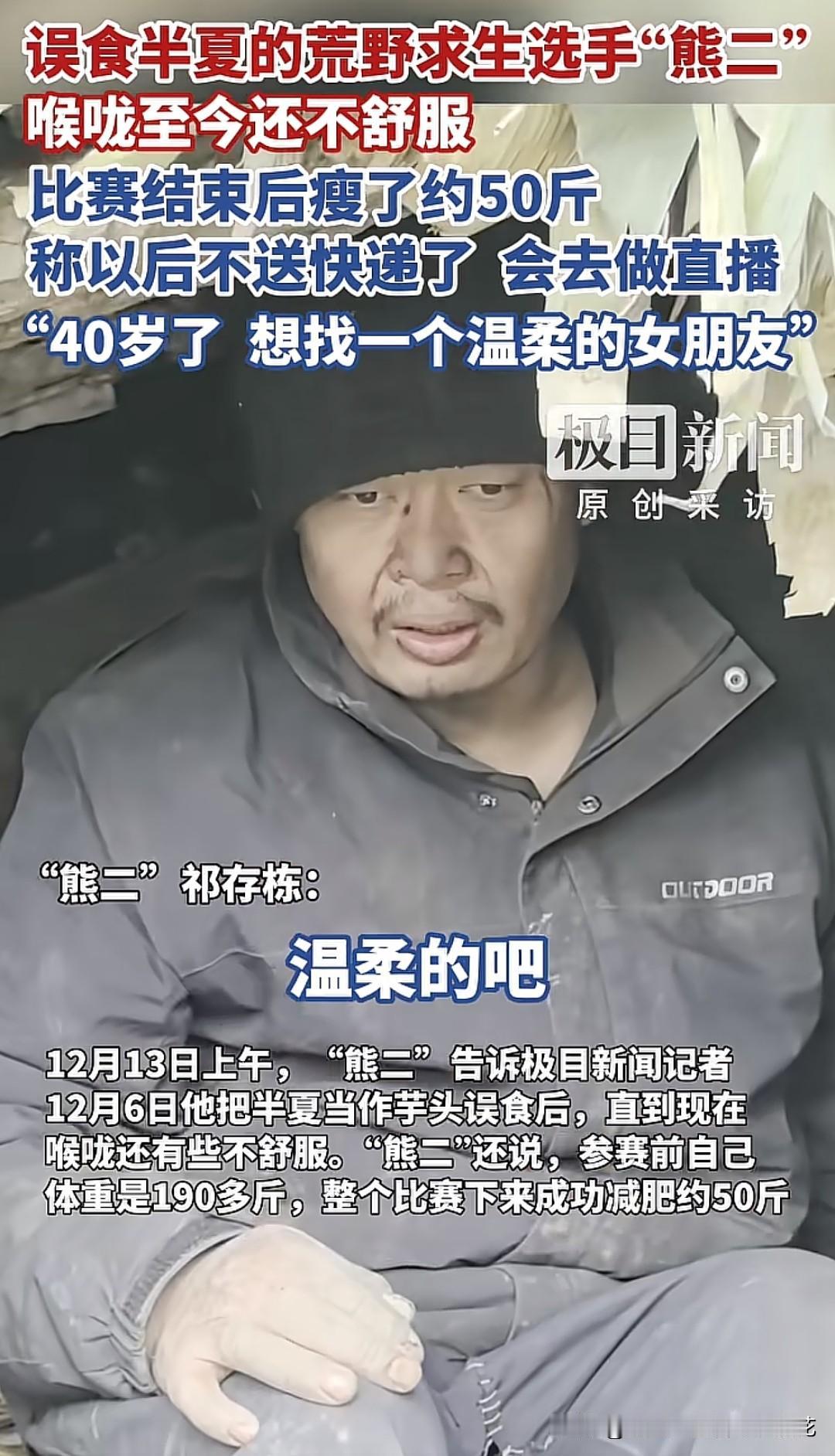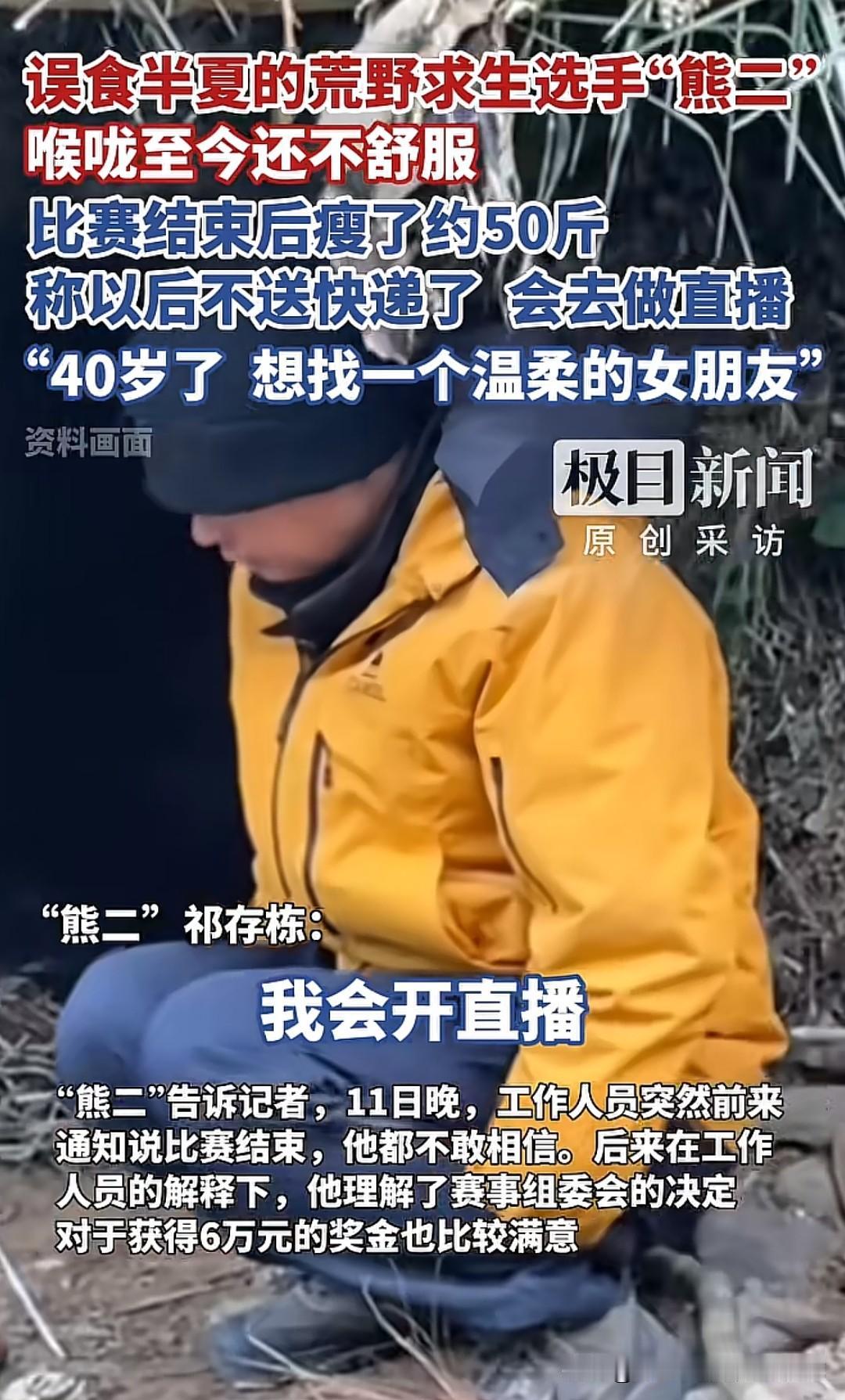 荒野求生选手“熊二”40岁了,还没有结婚,也没有女朋友,之前送外卖攒钱,发现远远