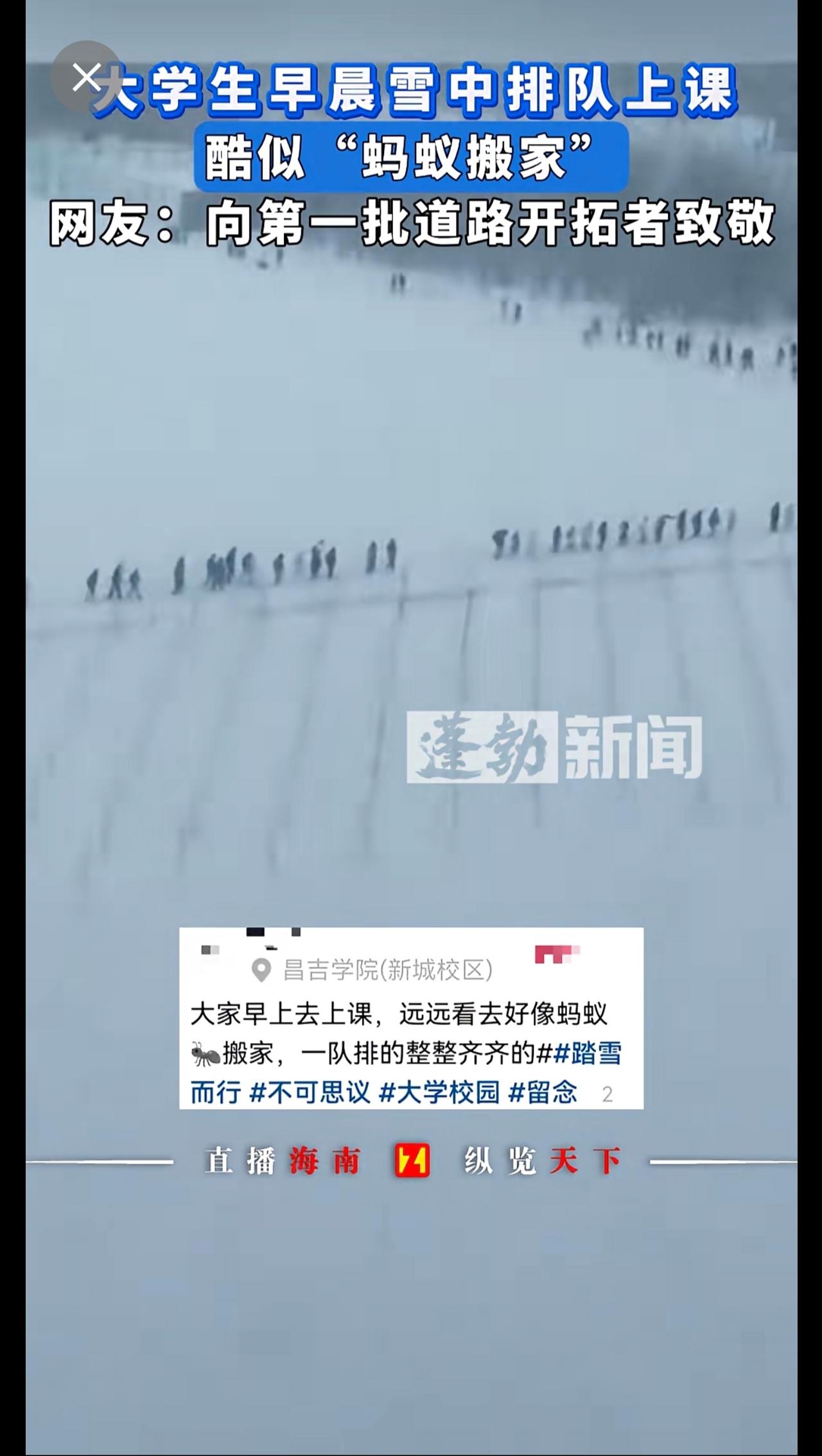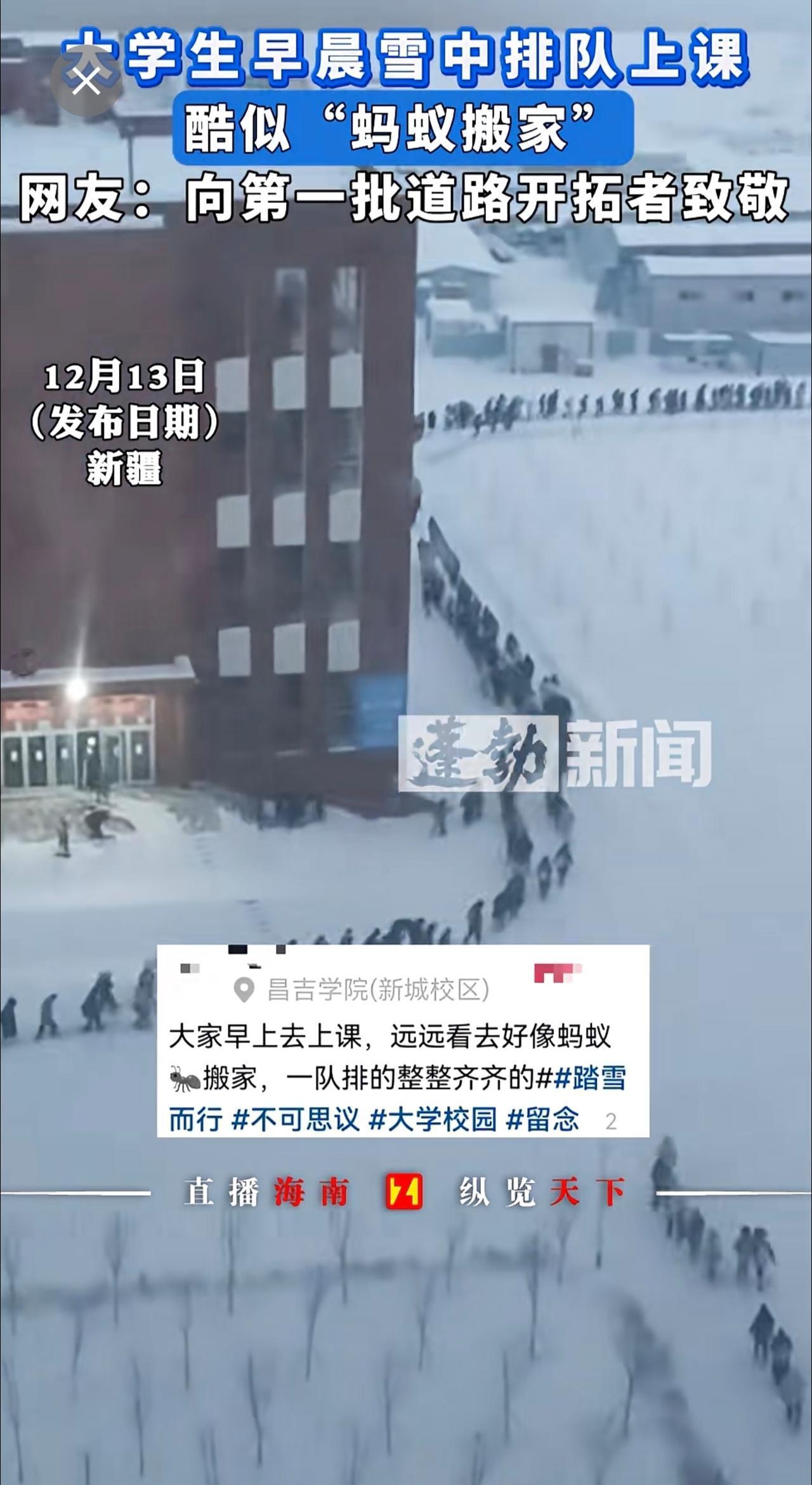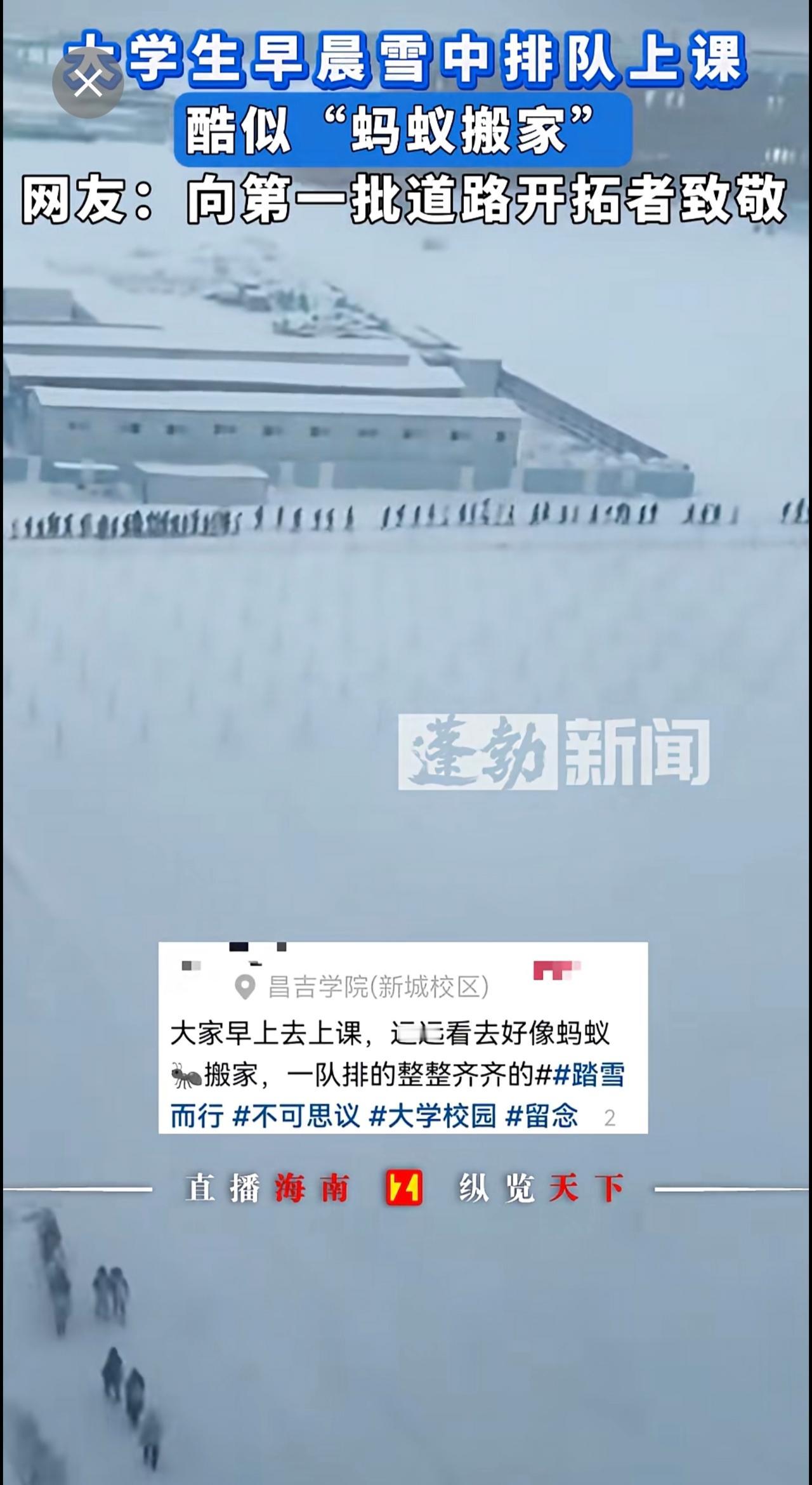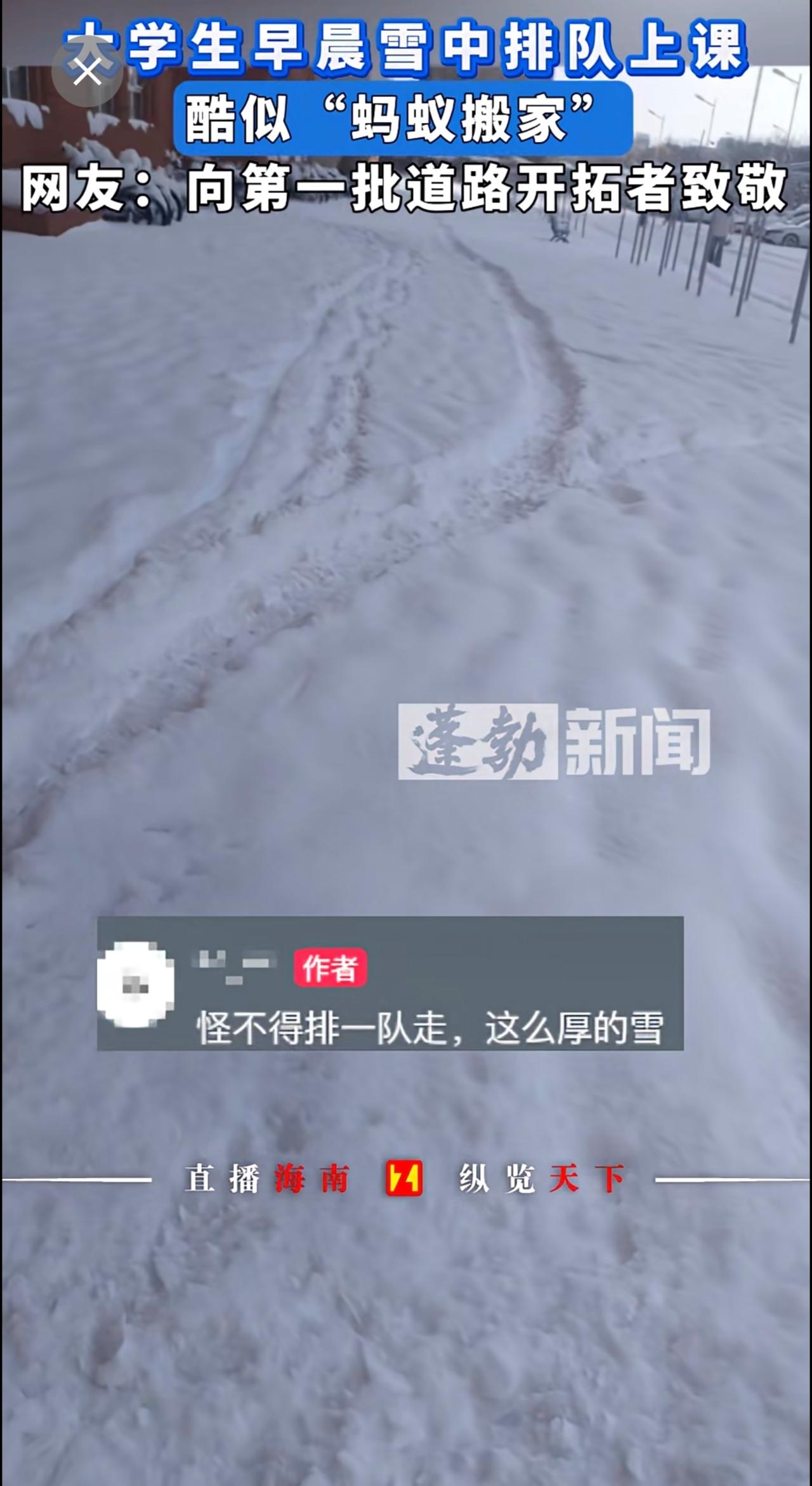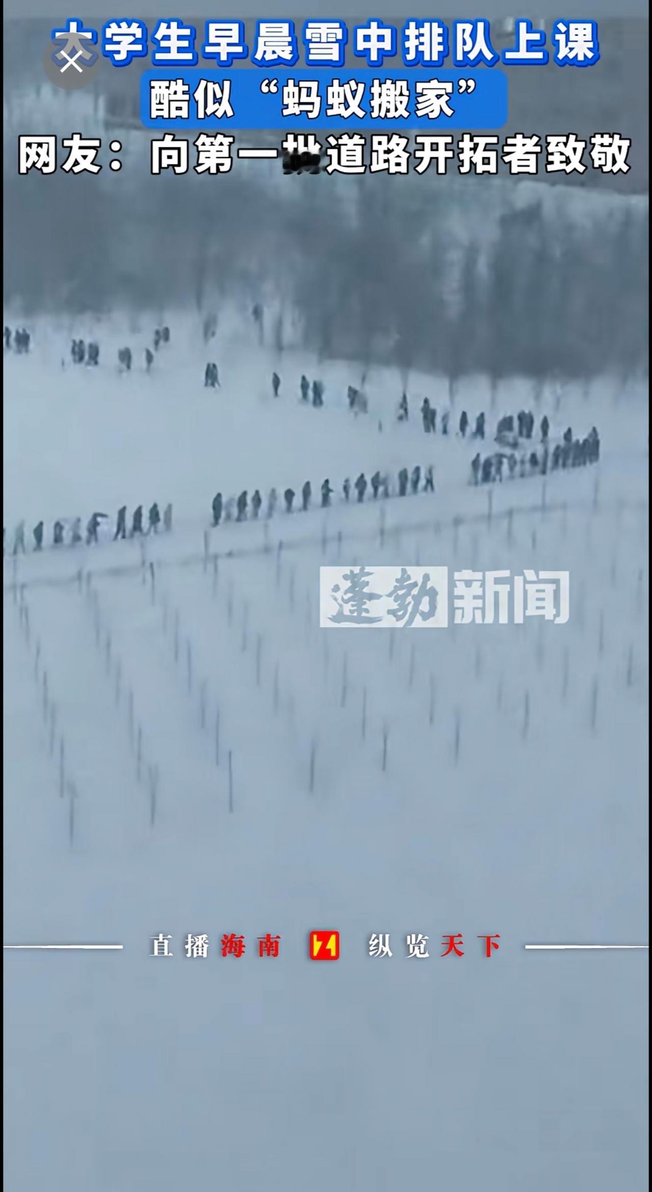 大学生早晨雪中排队上课,酷似“蚂蚁搬家”!网友:向第一批道路开拓者致敬大雪 大学生 (来源:*^_^*)