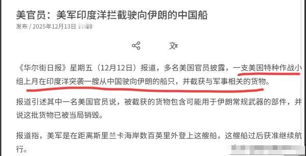 太嚣张了,银河号事件再现!美国公开登检从中国开往伊朗的船只!12月12日,根据《华尔街日报》报道,多名美国官员披露,一支美国特种作战小组上月在印度洋突袭一艘从中国驶向伊朗的船只,并截获与军事相关的货物。其中一名美国官员说,被截获的货物包含可能用于伊朗常规武器的部件,这批货物已被当局销毁。 根据《华尔街日报》12月12日透露的消息,一场隐秘的特种作战在上个月悄然展开,地点选在距离斯里兰卡海岸线数百英里的深海区域,也就是公海之上,这次的目标是一艘从中国出发驶向伊朗的商船,美国特种部队的行动充满了诡异的“海盗式”色彩:强行登船、翻箱倒柜,最后声称找到了一批“与军事相关的货物”。 最让人匪夷所思的一幕随后发生了,美军没有扣押船只进行司法起诉,也没有将所谓的“违禁品”带回港口公开展示,而是直接在甲板上把这批货物销毁了,随后大手一挥,放船走人。 这种“抓了、毁了、放了”的一条龙操作,在现代国际执法中极度罕见,要知道如果这真是证据,怎么能由当事人单方面销毁?这不禁让人怀疑,所谓的“销毁”,究竟是在处理违禁品,还是在搞一场死无对证的证据毁灭? 直到事情见报,全世界都还没见到这艘船的名字、国籍或者是货物清单,美国方面仅仅靠几名官员的一面之词,没有展示哪怕一张能佐证货物属性的实物照片,就单方面完成了“审判”和“行刑”。 这种既当警察又当法官,最后还顺手兼职刽子手的行为,彻底架空了程序正义,这种傲慢的背后,是一种深植骨髓的霸权逻辑:我的话就是法律,无论有没有证据,我说你有罪,你就有罪。 如果把目光投向法律层面,这种行径更是对《联合国海洋法公约》的公然践踏,按照国际公认的规则,公海不是任何国家的后花园,除了打击海盗等极端特殊情况,唯有船旗国才拥有对船只的管辖权。 事发海域既非美国领海,也不在其专属经济区,美军凭什么在此拦截、登检?一边是中国正在积极批准并推动BBNJ协定等国际海洋治理规则,另一边却是美国视国际法为无物,这种巨大的反差,赤裸裸地揭开了“基于规则的国际秩序”那层虚伪的面纱,规则只是美国用来约束别人的锁链,绝非束缚自己的准绳。 这种双标在军贸领域表现得尤为荒诞,美国作为全球最大的军火头子,每年的武器出口占据世界半壁江山,从输送给以色列的弹药,到导致也门人道主义灾难的对沙特军售,再到前不久高调向菲律宾倾销数十亿美元装备,美式武器在全球各个冲突热点肆意流淌。 然而这样一个向世界输送动荡的“军火商”,却摇身一变,开始对正常的商业贸易指手画脚,即便退一万步说,假设这艘船真的运载了常规部件,这也轮不到一个到处递刀子的人来扮演道德圣人,他们拦截的不是货物,而是试图通过切断中伊正常的经贸、能源往来,维持其在中东濒临破碎的掌控力,保护那岌岌可危的石油美元体系。 此次印度洋的“强盗行径”再次敲响了警钟:海上的商业通道就是国家的经济大动脉,当对手习惯于撕下文明的伪装直接下场“截货”时,单纯的抗议往往苍白无力,保护海外利益,不能仅靠国际公理的声援,更需要有能力在每一条关键航道上为商船撑起保护伞。 真理在大炮的射程之内,商贸的安全也同样存在于护航军舰的航迹之中,只有把远洋防卫力量铸造得如铜墙铁壁,才能让任何试图在大海上玩“拦路打劫”把戏的力量,在动手之前掂量掂量后果,当年的“银河号”之辱,绝不会被允许再次上演,因为我们手中,早已握紧了捍卫尊严的长剑。