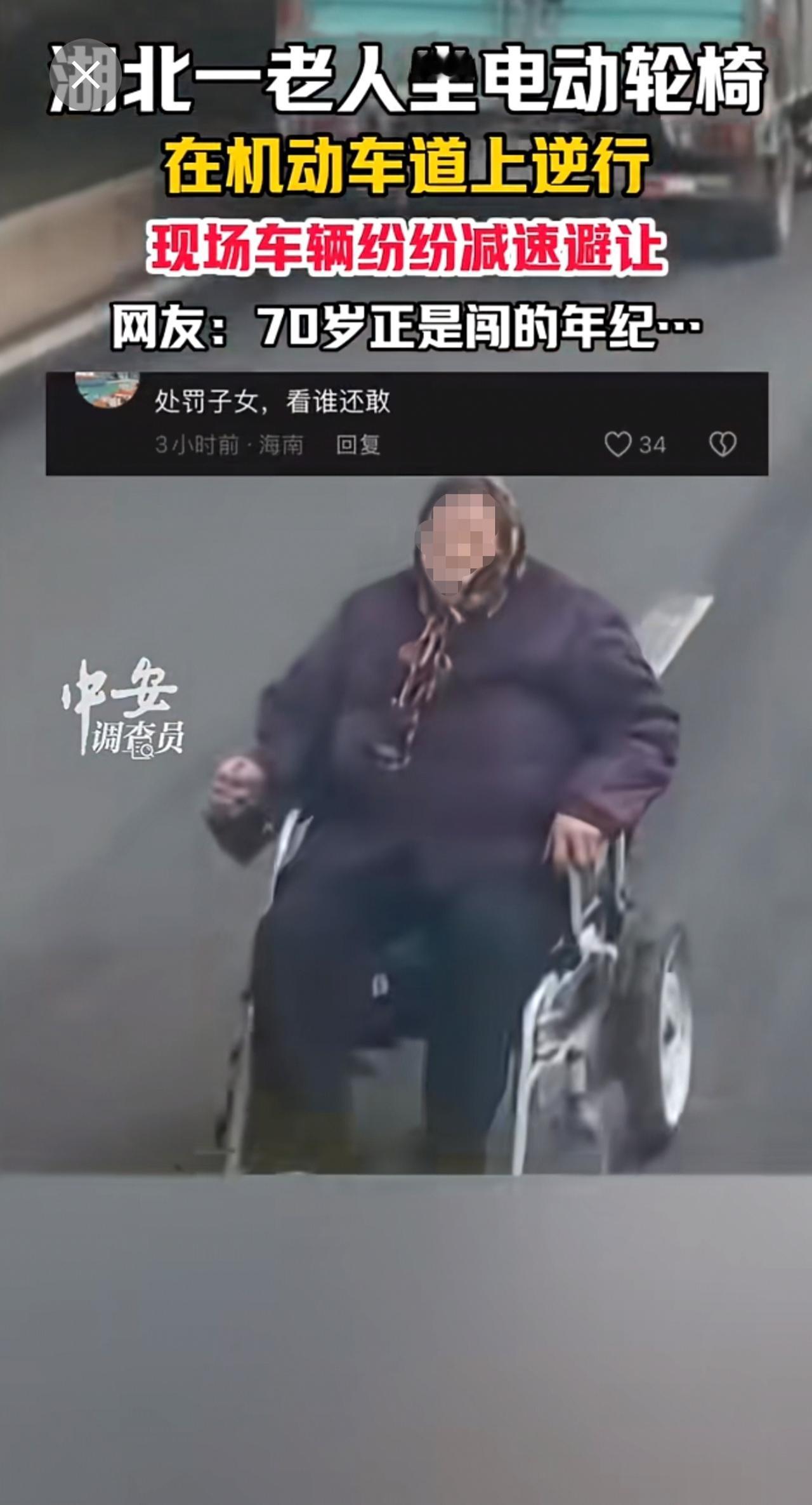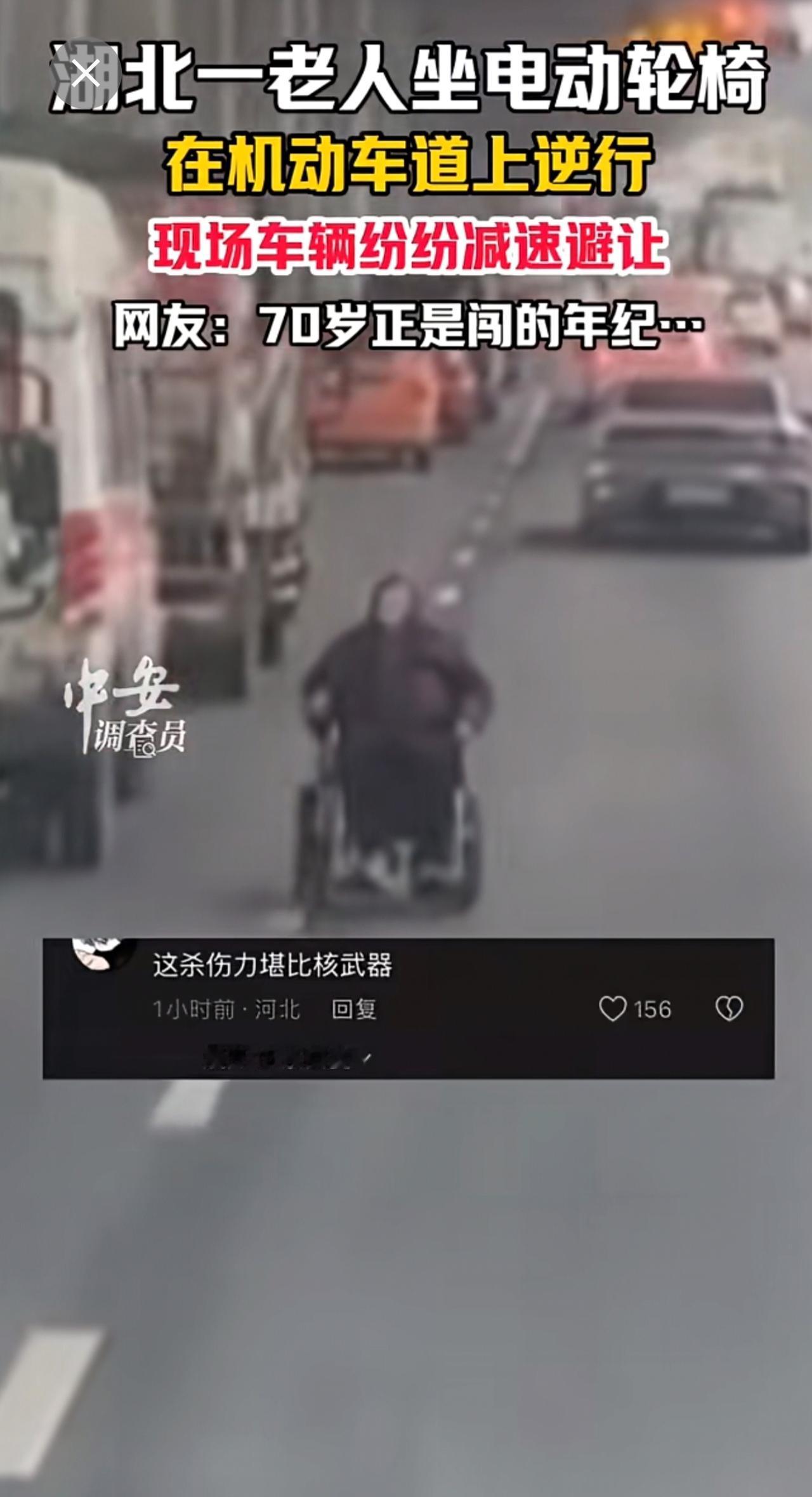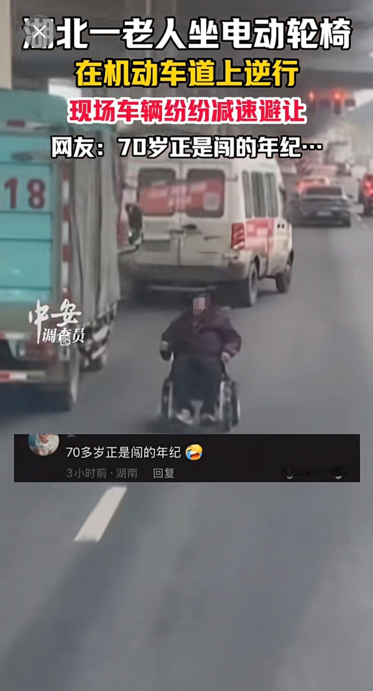 12月12日,湖北。湖北一老人坐电动轮椅,在机动车道上逆行,现场车辆纷纷减速避让,网友:70岁正是闯的年纪…(编辑:昊昊)