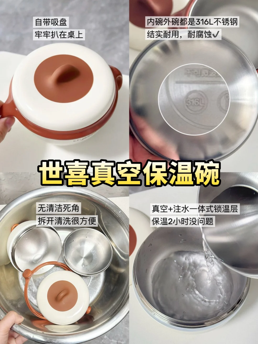 🔹世喜保温碗就很符合这些要求,内碗还能直接上蒸锅,也就是说孩子大了,家里还能继续用而不会闲置。它的底部吸力超强,宝宝吃辅食以来就没有打翻过😂。如果你也只需要1个辅食碗就够,那么买一个世喜保温碗,就非常OK了!