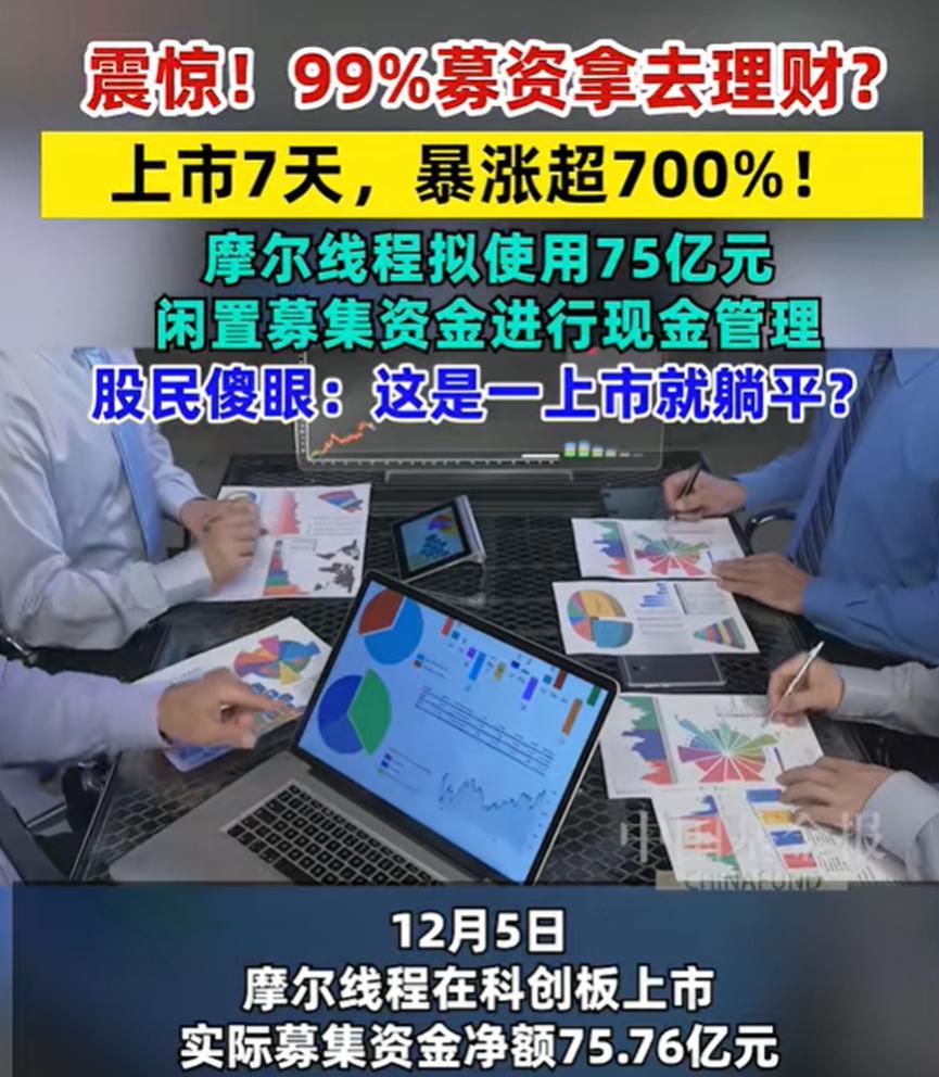 摩尔线程的这份公告,看起来挺魔幻的。 12 月 12 日晚间,摩尔线程发公告,准备拿不超过 75 亿元的闲置资金买理财产品 。 而这笔钱,正是其IPO扣除发行费后到手的全部净额。 六天前,摩尔线程 刚刚完成IPO,招股书白纸黑字写着:“募资用于新一代自主可控AI训推一体芯片、图形芯片、AI SoC芯片研发……” 前脚说急需募资用来研发,后脚就把近乎全额的资金划入理财账户,这场“闪电理财”的魔幻操作,让不少股民直呼看不懂。 上市公司将闲置的募集资金拿去理财赚利息,完全没问题。但很少出现像摩尔线程这样,将全部募集资金的99%拿去理财。 更何况,摩尔线程才上市第六天,就迫不及待发公告说我要玩理财了,这就只能说明,其募投项目根本不缺钱,也不急用钱,既然如此,募资为何要一步到位吗? 你要是知道前期用不了这么多,为什么不分批募资呢? 股民自己的钱,自己他不会理财吗? 早知道拿着股民的钱去存理财,股民干脆自己去买理财好了。 毕竟,大家买的是“摩尔线程的芯片未来”,不是“摩尔线程代买的理财”。