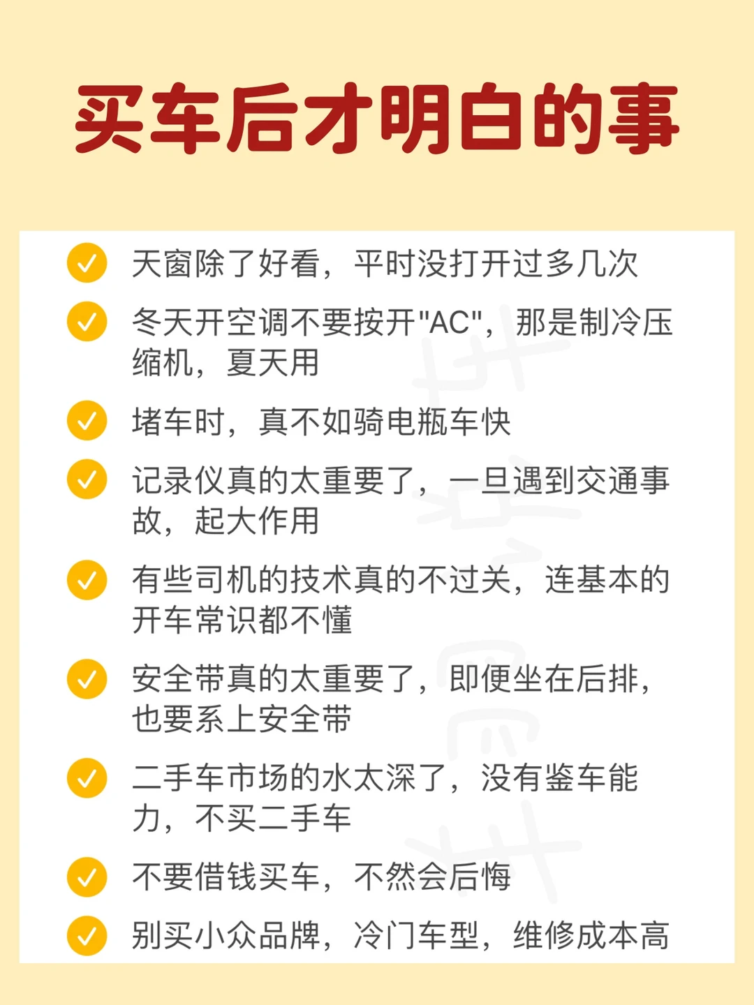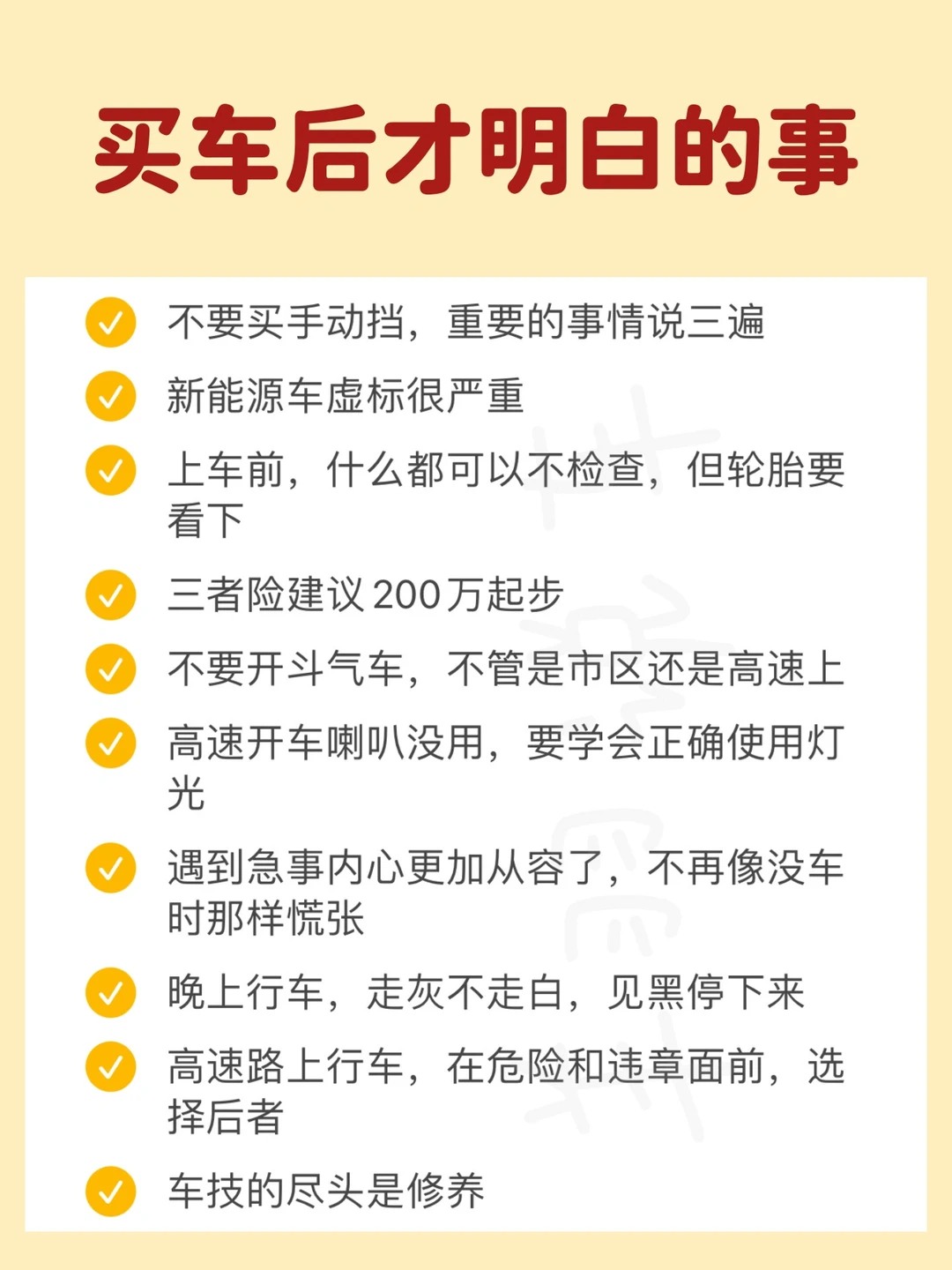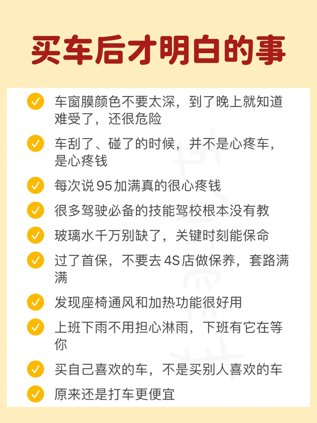 买车后才明白,不要太在意后排空间,可能连副驾驶都没人坐。 下雨了才知道有车是多么幸福,风里雨里都在等你。 遇到事情也更加从容了,不像没车💰那么慌张,一下子长大了。 出门想穿什么穿什么,不用拎着大包小包,手机和车钥匙就出门了 去想去的地方,去看不一样的风景。
