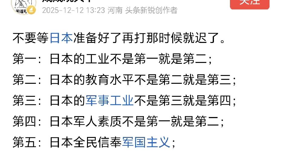 第一,日本的工业这些年基本是和德国轮流第三,距离第二的美国差距很大。 第二,整体教育水平很难量化,但日本关键学科成绩、毕业率等因素的全球公立中小学教育质量排名中,日本位列第10,学生科学学科表现居世界第5,数学学科居世界第6。 第三,日本的军事工业别说第三第四,恐怕前十都不一定能进得去。日本在37项核心军工技术中仅有11项实现国产化,整体武器装备自主化率不足40%,2020-2024年武器进口量较上一个5年暴涨93%,成为全球第六大武器进口国。导弹、雷达等关键装备自主化率不足60%;F-35战斗机等核心装备以美国进口或授权组装为主,核心系统完全依赖美方,采购单价是美军的1.8倍;“出云”级准航母、“摩耶”级驱逐舰等平台虽实现本土建造,但核心部件仍存在对外依赖。 第四,日本自卫队军人整体素质呈断崖式下滑,和军队应有的战斗属性严重背离。一是人员老龄化严重,官兵平均年龄达38.5岁,远超中美等国一线部队,难以适应现代战争的高强度体能与抗压需求;二是制度“公务员化”,官兵多朝九晚五打卡上下班,战备意识淡薄,突发状况下集结效率极低;三是训练“温室化”,为留住兵源降低训练强度,比如高温天停高强度训练,训练脱离实战;四是兵源质量差,因待遇低、内部霸凌等问题征兵困难,只能靠“萌文化”吸引宅男入伍,士兵多为混稳定工作,缺乏保家卫国的战斗精神,还频发直升机坠毁、F - 35坠海等低级事故。 第五,属实,看高市早苗的支持率就清楚了。 所以,不要盲目相信什么日本能几个月造出原子弹,日本军事实力很强等等鬼话。