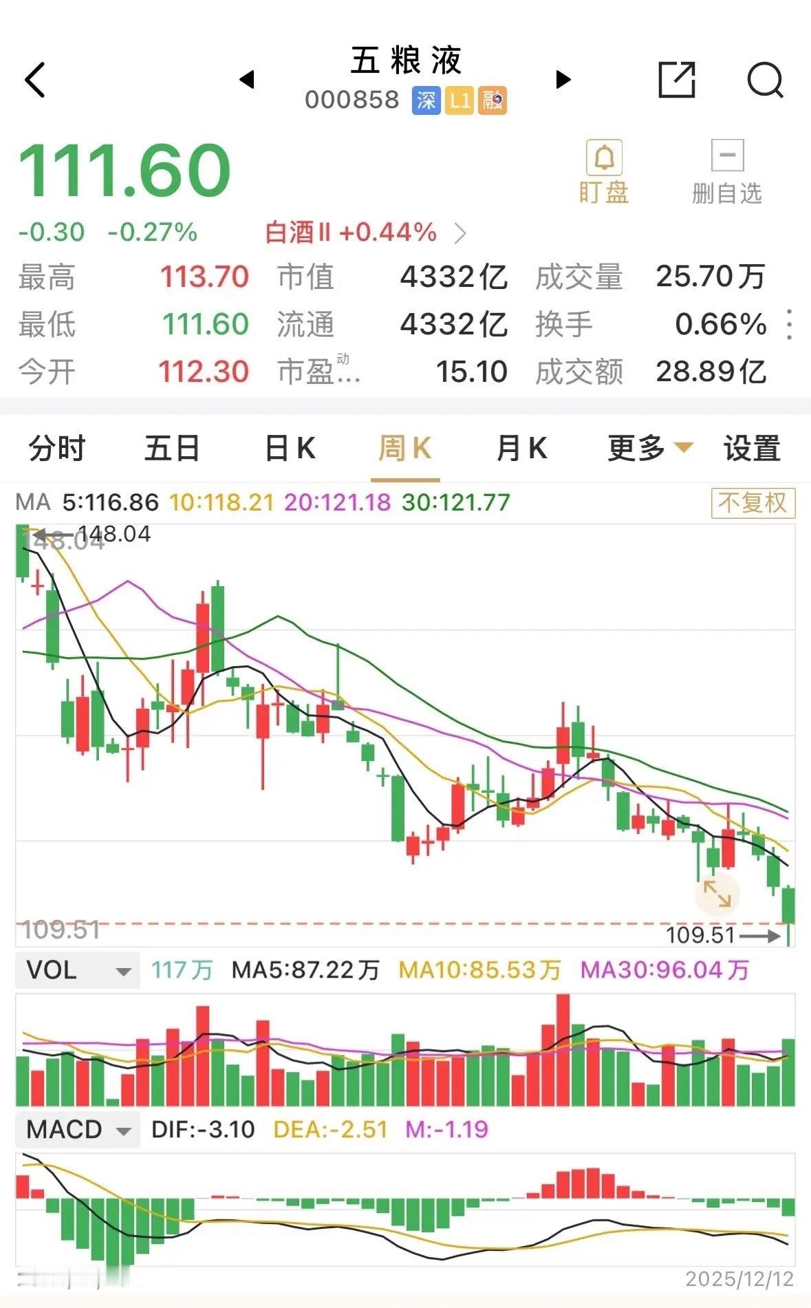 五粮液周五早盘走势是优于板块的,一度涨幅超过1.5%。收盘却逆板块涨幅0.44%的基础上,下跌0.27%,以111.6元当天最低价格收盘,在周线形态上呈现出加速向下的趋势,令人失望至极。五粮液将在下周四除息百亿元,除息后彼时或有资金逢低回流的机会。抵近年关,目前的五粮液走势需要证明三季度报业绩同比大幅下滑65%至仅20亿元,只是个特例,其经营决策层亦需推出更多稳定经营策略,才方可有望扭转市场预期。