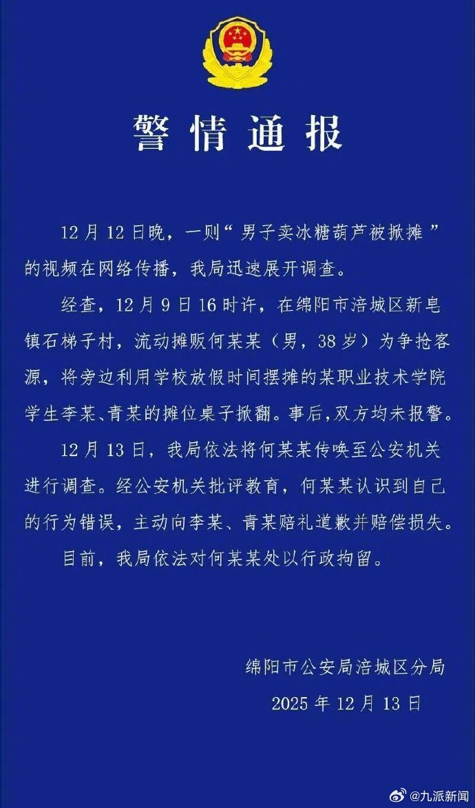 【#警方通报男子争抢客源掀他人摊位#】#摊贩抢客源掀翻他人摊位被行拘# 四川省绵阳市公安局涪城区分局12月13日晚发布警情通报:12月12日晚,一则“男子卖冰糖葫芦被掀摊”的视频在网络传播,我局迅速展开调查。经查,12月9日16时许,在绵阳市涪城区新皂镇石梯子村,流动摊贩何某某(男,38岁)为争抢客源,将旁边利用学校放假时间摆摊的某职业技术学院学生李某、青某的摊位桌子掀翻。事后,双方均未报警。12月13日,我局依法将何某某传唤至公安机关进行调查。经公安机关批评教育,何某某认识到自己的行为错误,主动向李某、青某赔礼道歉并赔偿损失。目前,我局依法对何某某处以行政拘留。