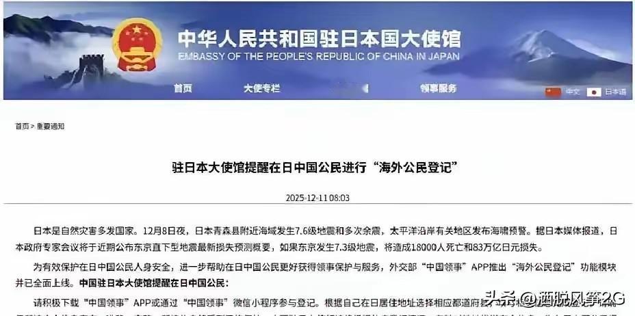 中国开始清点在日华人数量,日本一下子慌了。 12月11日,中国驻日本大使馆发布通知,要求所有在日中国公民通过 “中国领事” APP 或小程序完成“海外公民登记”。同时提醒近期避免前往日本。 很多人误解这是“清点人数”,其实不然。这项登记是外交部领事司的常规功能,核心是为了在紧急情况发生时,能第一时间联系到同胞、提供救助,信息全程加密仅用于领事保护,既不影响签证状态,操作也只要3分钟就能完成。截至2025年3月,在日合法居留的中国人已超120万,占日本外国人口的27.6%,相当于日本一个中等县的人口规模,东京首都圈就聚集了44%的华人,池袋、高田马场等地早已形成成熟的华人社区。这120万人里,有11万是留学生,毕业后63.7%会选择留下工作;有超过2万的经营管理签证持有者,全球一半以上的该类签证申请者都是中国人;还有大量持有特定技能签证的从业者,在建筑、护理等日本劳动力短缺的行业打拼。 日本的“慌”并非空穴来风,背后是多重风险的叠加。12月8日以来,日本本州东部海域连续发生多起地震,最大震级达7.5级,引发海啸预警,超10万人被要求避难,后续还可能有更大地震或火山喷发。更让人不安的是,12月5日东京电力公司刚启动第17轮核污染水排海,累计排放量已超12.5万吨,其中含有的氚、锶-90等放射性物质,会通过食物链富集威胁健康。政治层面的风险同样不容忽视,日本首相高市早苗公然发表涉台错误言论,将“台湾有事”与日本“存亡危机事态”绑定,导致中日关系降温,近期在日华人遭遇的违法犯罪案件也明显增多。 这些风险已经切实影响到华人的生活。东京池袋的华人餐馆老板老李,最近每天都会在“中国领事”APP上刷新地震预警,店里的应急包早已装满饮用水和压缩饼干;留学三年的小林,原本计划毕业后留在大阪工作,现在却开始犹豫——核污染水排海让她担心食品安全,频繁的地震也让远在国内的父母寝食难安;在东京从事护理工作的张姐,持有特定技能签证,她所在的养老院有不少老人,每次地震警报响起,组织疏散都让她神经紧绷。 日本的心态很矛盾。一方面,它迫切需要中国人才和劳动力,老龄化导致日本护理行业缺口就达60万人,政府定下2030年前引进600万外籍人才的目标,中国因文化相近成为主要来源;另一方面,民间却有不少排斥情绪,调查显示约90%的日本受访者表示“不欢迎中国人居住”,部分店铺甚至挂出歧视性标识。中国游客曾贡献日本旅游营收的34.3%,但随着使馆提醒发布,大阪、北海道的酒店订单取消率飙升至50%-70%,预计将给日本造成1.79万亿日元的经济损失。 所谓“中国清点人数”的说法,本质是对领事保护工作的误读。中国使馆的通知,既是对120万在日同胞安全的负责,也是对潜在赴日公民的善意提醒。日本真正该慌的,不是华人登记本身,而是自己以邻为壑的排海政策、日益升级的地缘风险,以及对华人既依赖又排斥的矛盾心态。一个国家的安全环境和政策诚信,才是留住人才、吸引游客的关键。 120万在日华人的选择,背后是普通人对更好生活的追求,也是全球化时代的现实写照。但安全永远是第一位的,使馆的登记通知和出行提醒,正是国家对海外同胞最坚实的后盾。各位读者你们怎么看?欢迎在评论区讨论。