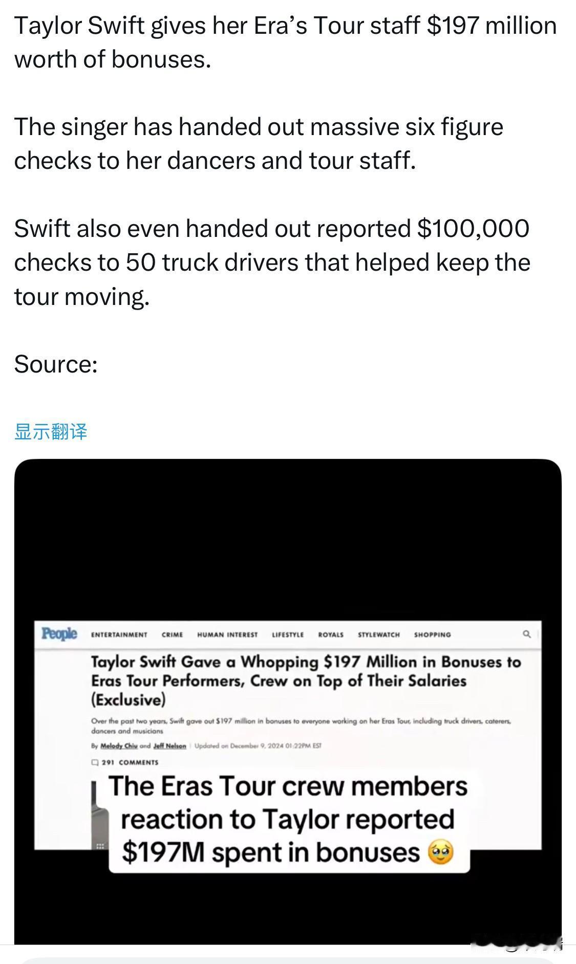 泰勒·斯威夫特为她的“时代巡回演唱会”工作人员发放了价值 1.97 亿美元的奖金。 这位歌手给她的舞者和巡演工作人员开出了高达六位数的支票。 据报道,斯威夫特甚至向 50 位帮助巡演顺利进行的卡车司机发放了 10 万美元的支票。 泰勒·斯威夫特(Taylor Swift)是一位享誉全球的创作型歌手和流行巨星,以其真诚的歌词、朗朗上口的旋律和跨越流派的音乐才华而闻名。她的职业生涯硕果累累,曾多次获得格莱美奖,包括创纪录的四次年度专辑奖,并且是历史上首位仅凭音乐创作和表演就成为亿万富翁的艺术家。 泰勒·斯威夫特简介 音乐风格演变: 斯威夫特于2006年以乡村音乐歌手身份出道,后来成功转型为全球流行巨星。她的音乐作品以其标志性的故事性歌词而著称,深受乐迷喜爱。 作品与成就: 她已经发行了12张原创录音室专辑和4张重录专辑(称为"Taylor's Version"),所有专辑都取得了巨大的商业成功和评论界的好评。 版权斗争: 在与前唱片公司就母带版权发生争议后,斯威夫特开始重新录制她的前六张专辑,以重新掌控自己的音乐作品,这一举动赢得了粉丝的广泛支持。 文化影响力: 斯威夫特拥有庞大的全球粉丝群,被誉为“斯威夫特效应”(Swiftonomics),她的每次举动都能对全球经济和文化产生巨大影响。 “时代巡回演唱会”(The Eras Tour) “时代巡回演唱会”是泰勒·斯威夫特举办的第六次全球巡回演唱会,也是她迄今为止规模最大、影响力最深远的巡演。 核心概念: 此次巡演的设计初衷是为了回顾并庆祝斯威夫特职业生涯中的所有音乐“时代”(即每一张录音室专辑),因为她在疫情期间发行了多张专辑,但在巡演前有近五年没有进行全球巡演。 规模空前: 巡演于2023年3月17日在美国格伦代尔启动,共计149场演出,横跨五大洲的51个城市。 破纪录的成功: “时代巡回演唱会”在商业和口碑上都取得了巨大成功。它是历史上票房最高的巡回演唱会,总收入超过20亿美元,并创造了多项场地和门票销售记录。 文化现象: 演唱会门票需求空前,引发了全球范围内的“抢票”热潮和对票务行业垄断的关注。在每个举办城市,演唱会都极大地促进了当地经济(如旅游业和酒店业)的发展。 电影版: 斯威夫特将洛杉矶站的演出制作成了电影《泰勒·斯威夫特:时代巡回演唱会》(Taylor Swift: The Eras Tour),该片成为史上票房最高的演唱会电影。 纪录片: 一部名为《泰勒·斯威夫特:一个时代的结束》(Taylor Swift: The End of an Era)的六集纪录片系列于2025年12月在Disney+上线,提供了巡演的幕后花絮和深度故事。 “时代巡回演唱会”不仅是一场音乐盛宴,更是一次前所未有的全球文化现象,巩固了泰勒·斯威夫特作为当代最具影响力和号召力艺术家之一的地位。