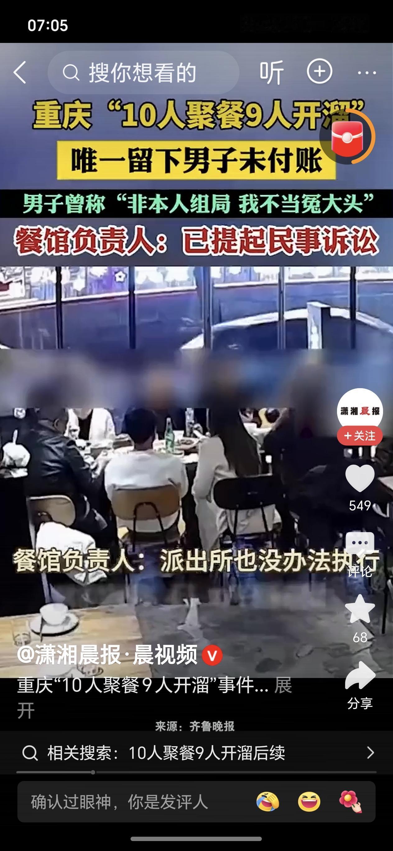 留下男子已被起诉重庆一男子受邀和朋友去餐厅吃饭,10个人聚餐共花了1262元,结果10人中9人陆续开溜,留下的这位受邀男子拒绝买单,声称自己不是组饭局者,不当冤大头! 这事听着真丢人,这是朋友做的事吗?事实证明酒肉朋友不可交,要远离这种成事不足,败事有余的狐朋狗友!