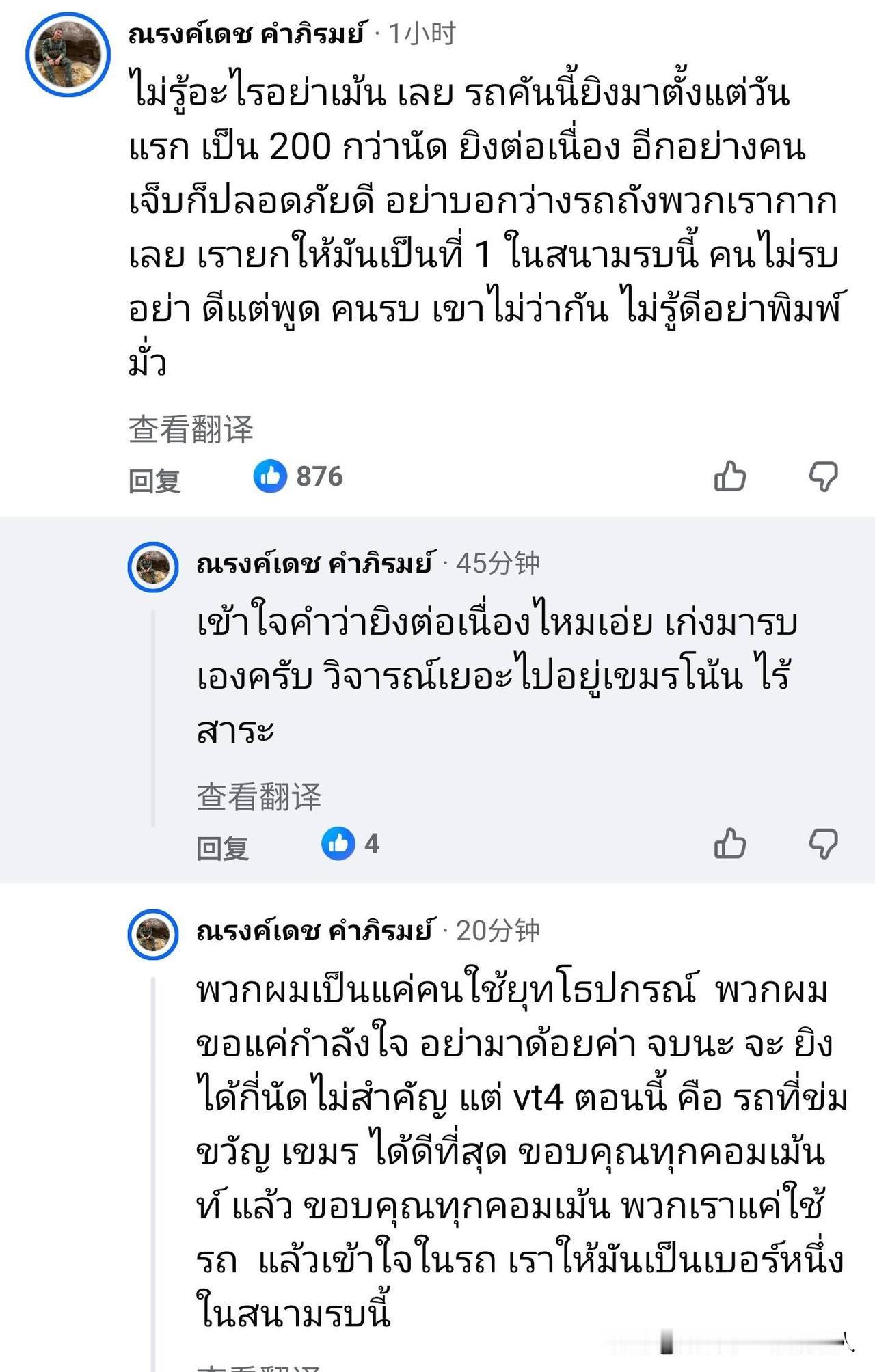正在泰柬前线作战,对VT-4坦克给予很高评价的泰国陆军第二军区第六步兵师第21骑兵营三等中士纳隆德·康丕蓬,他在一篇描述在前线作战的VT-4发生炸膛事故的帖子下回复: “不懂就不要乱评论。这辆车从第一天就开始射击,已经打了 两百多发,而且是持续不断的。另外,受伤的人也都平安无事。别说我们的坦克弱,这辆坦克在战场上可是首屈一指的。没上过战场的就别瞎说,上过战场的才懂。不懂装懂就别胡说八道。 你明白什么叫“持续射击”吗?有本事的话就自己上战场吧批评太多的话,你去柬埔寨那边吧。真是荒谬 / 无聊至极。 我们只是装备使用者,我们需要的只是精神支持,请不要轻视我们。就是这样。开火次数多少并不重要,但就目前而言,VT4坦克是威慑柬埔寨军队最有效的武器。感谢大家的评论。我们只是使用这辆坦克,了解它的性能。我们认为它是战场上最强大的武器。 你们现在已经改变不了什么了,因为战争已经爆发了。 如果你们早就知道,那当初刚买这坦克的时候怎么不来评论?现在只需要给我们一些鼓励,就这样。 当我们真正和它一起作战时,我和这辆坦克已经是一体的了,谢谢 🤙我们彼此信任、彼此依靠。 如果能换装备当然好,但现在已经什么都改变不了了, 请给我们一些支持吧。” 小编说~通常持续射击200多发,就是打了4-5个炮弹基数,VT4坦克在前线通过炮弹车补给,当火力输出点用了! 柬泰军事冲突 柬埔寨炮击泰国 泰柬军事冲突 泰柬交火