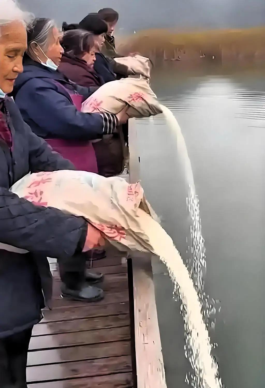 做善事方式有千万种, 有见过放各种鱼类, 捐物捐款的。 但罕见地把大米往河里倒, 到底是行善积德还是浪费粮食。 社会上还有许多贫困户, 这种慈善行为违背了良心道德。