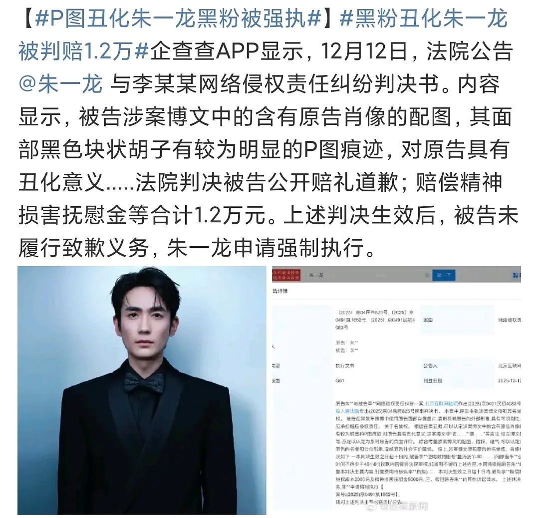 朱一龙告黑强制黑子执行道歉+赔偿1.2万
