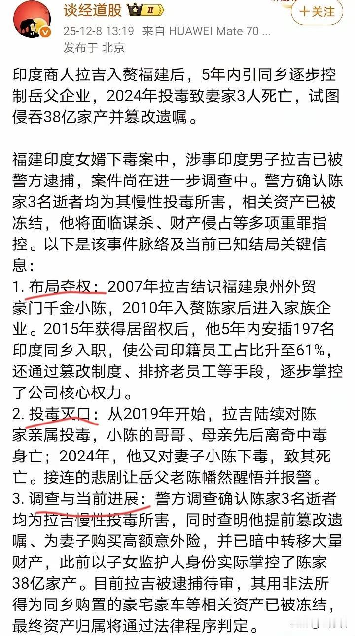看到一位网友爆料,印度女婿如何一步步侵吞妻子巨额家产,并且投毒毒死妻子一家人的案