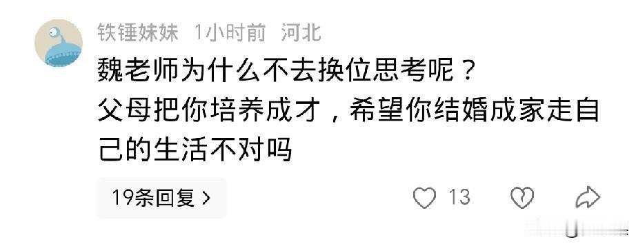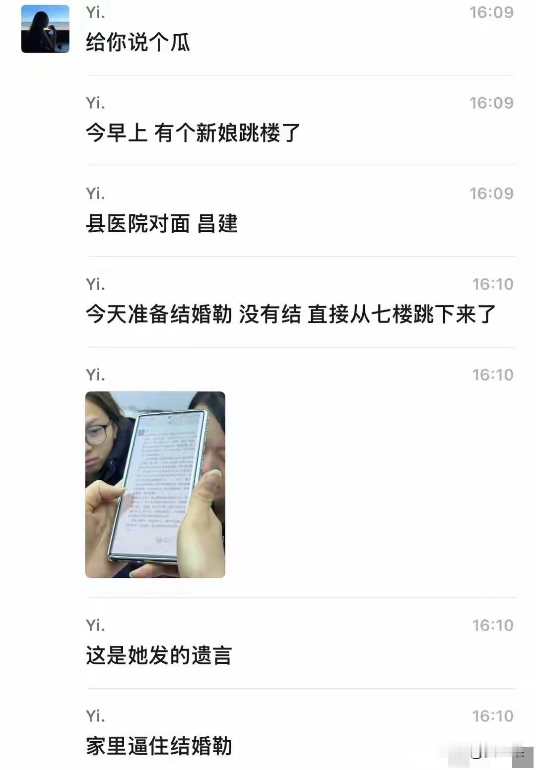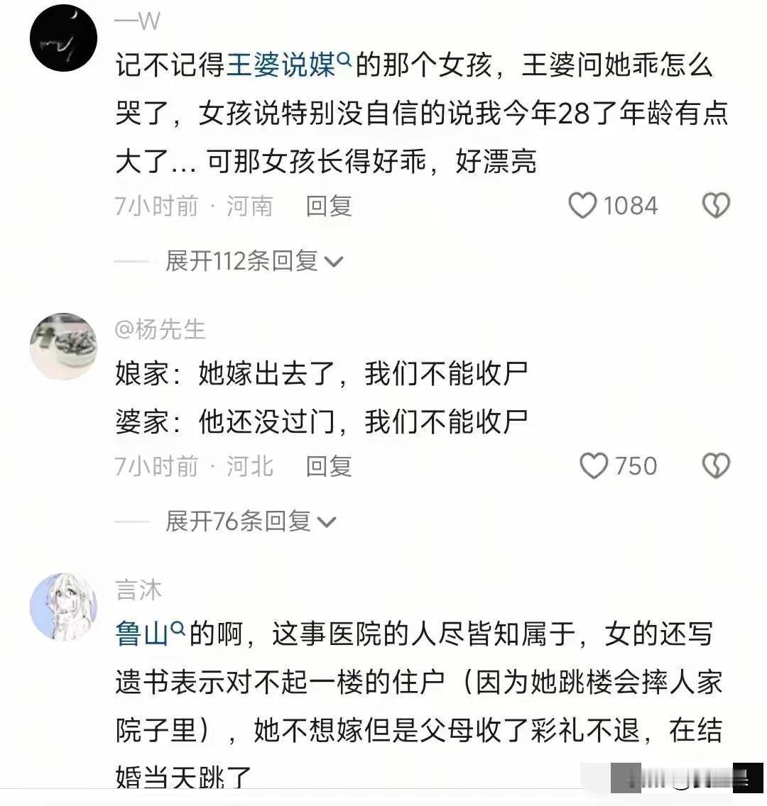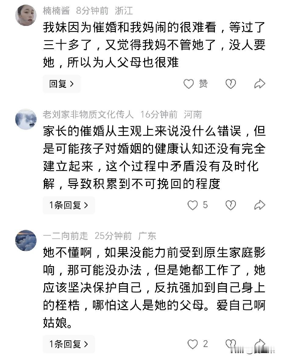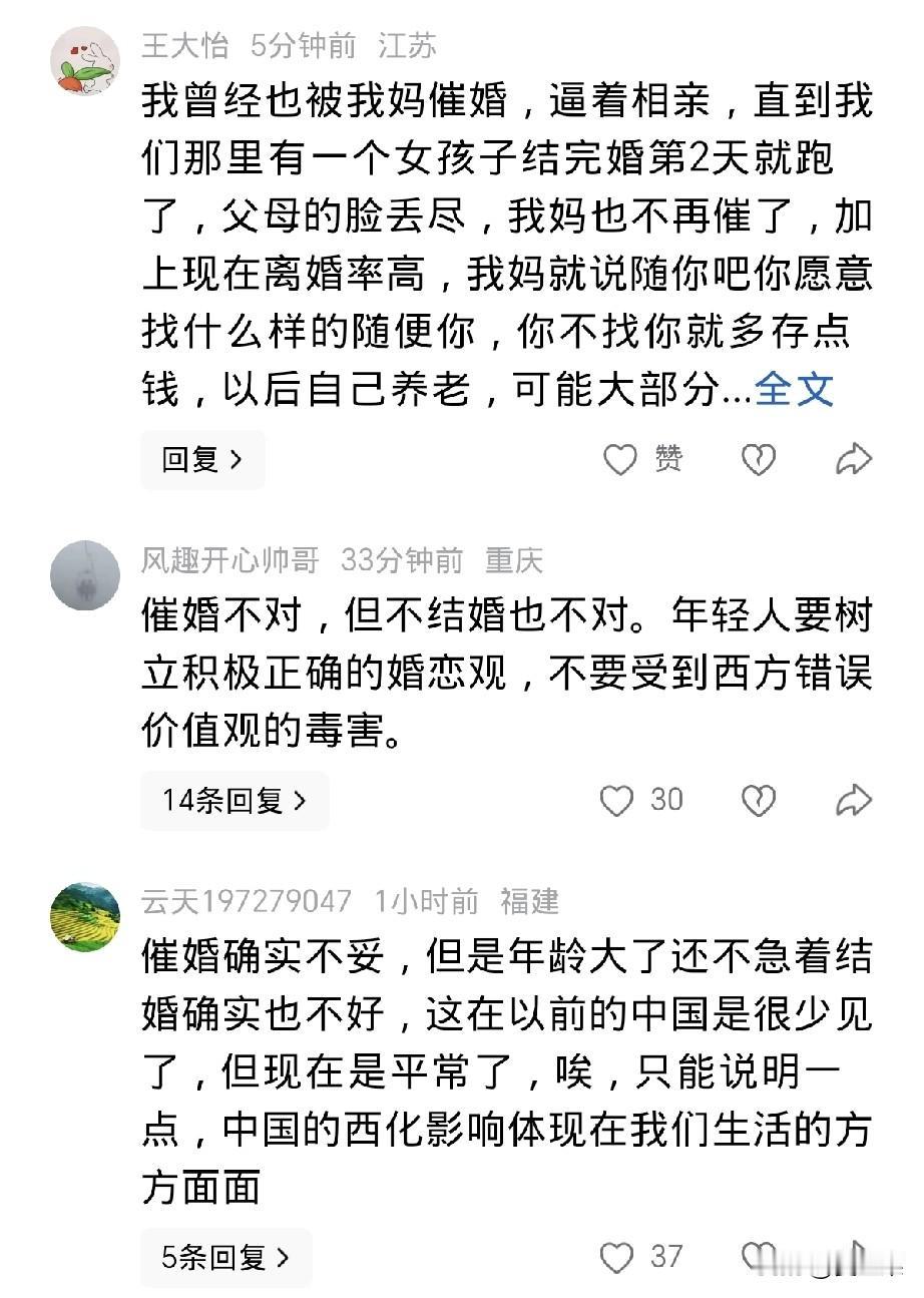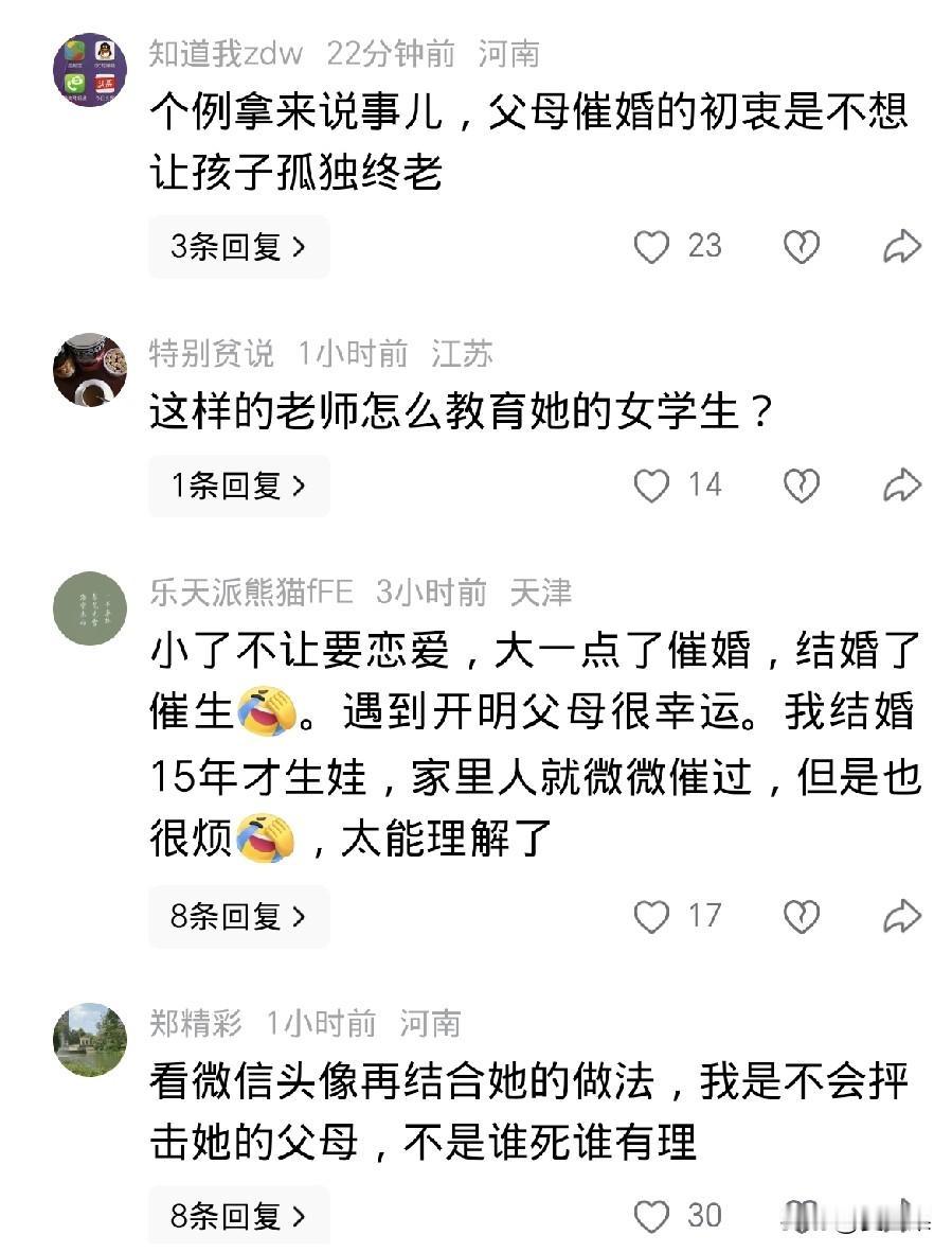 惋惜, 鲁山县一名高中老师, 在当地最好的高中上班, 是在编老师, 受到学生喜爱, 28岁如花的年纪, 这些被多少人羡慕的条件, 却在结婚当天跳楼了, 遗言是不想结婚却被逼婚,便以死抗争了。 惋惜她这条生命,根本不至于死, 痛惜关于结婚的话题,分明就是孩子跟父母决裂的东非大裂谷。 已经28岁了,这个年纪不是青春期的学生,自己又有了经济独立权,就算父母逼婚也不至于寻死觅活啊, 不过不排除早已因为结婚导致的家庭矛盾,身患抑郁症,最终抗争无果。 但是,父母逼婚的目的是什么?难道不是为了孩子着想,担心父母老去的那天,孩子孤苦无依? 尽管会遇到婚姻的种种不如意,可是父母的一片丹心不是坏心,是好意啊。 女教师的这一跳,其实不是个例的表现,而是代表了很多现代年轻人的心声, 不想结婚, 只是她决绝跳下去了。 这让正在,或者将要苦口婆心规劝孩子结婚的父母 当头一击。 以后父母怎么敢冒天下之大不韪,置孩子生命于不顾,去催婚呢? 孩子与父母的关系将如履薄冰, 父母不再催婚,只能努力劝自己放平心态,抱着子孙自有子孙福的念头,安慰自己,可是心中的苦涩,对孩子未来的担心仍会存在,或许将来抑郁的是家长。 孩子不想结婚,任凭自由自在,只看今朝,不看未来。 成为时代的特点,时代的痛。 结婚一时美好,一辈子牢笼, 想想社会如今赋予女人的条条框框, 哪个女孩儿会甘心? 所以,这一跳, 也绝不只是孩子的问题,也不只是父母的问题, 是社会的问题,是我们都要努力解决的问题。