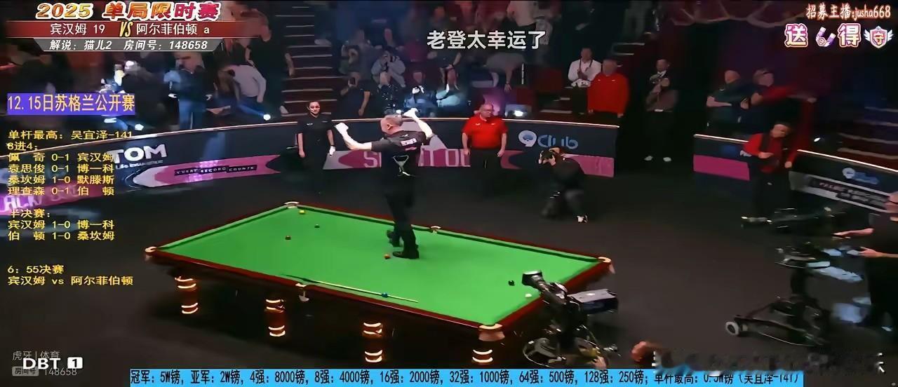 激动坏了,幸运极了,这就是斯诺克单局限时赛冠军阿尔菲伯顿。 激动坏了是这位老将一路过关斩将,最后跳上球桌疯狂庆祝,世台联去年不想让他参加冠中冠,这一回更挡不住了。 幸运极了是说这位老将本不该出现这里,由于卡特退赛,幸运的拿到外卡,没想到苍天有眼,一堆小年轻竟然无法降伏他。 好在75三杰都没有来,来了更值得庆贺这位被压制多年的老朋友,祝贺伯顿这位年龄最大的冠军!