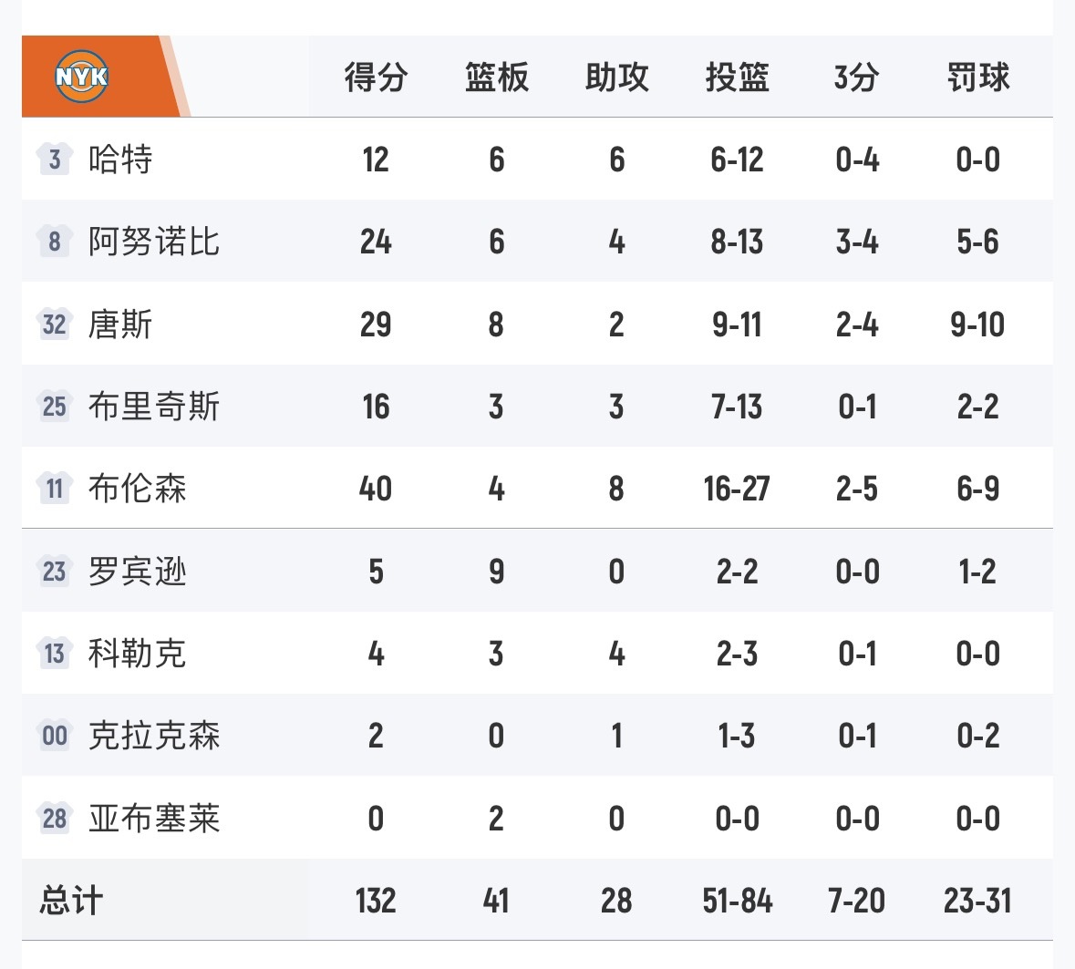 布伦森40分4板8助攻,尼克斯132-120击败魔术,打进NBA杯决赛。魔术v