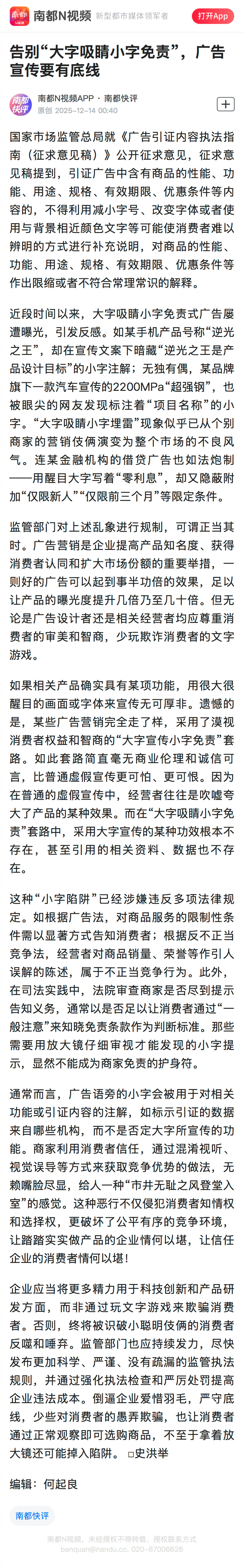 #广告小字陷阱该管管了#【南都快评:告别“大字吸睛小字免责”,广告宣传要有底线】#广告大字吸睛小字免责无赖嘴脸尽显#如果相关产品确实具有某项功能,用很大很醒目的画面或字体来宣传无可厚非。遗憾的是,某些广告营销完全走了样,采用了漠视消费者权益和智商的“大字宣传小字免责”套路。如此套路简直毫无商业伦理和诚信可言,比普通虚假宣传更可怕、更可恨。因为在普通的虚假宣传中,经营者往往是吹嘘夸大了产品的某种效果。而在“大字吸睛小字免责”套路中,采用大字宣传的某种功效根本不存在,甚至引用的相关资料、数据也不存在。通常而言,广告语旁的小字会被用于对相关功能或引证内容的注解,如标示引证的数据来自哪些机构,而不是否定大字所宣传的功能。商家利用消费者信任,通过混淆视听、视觉误导等方式来获取竞争优势的做法,无赖嘴脸尽显,给人一种“市井无耻之风登堂入室”的感觉。这种恶行不仅侵犯消费者知情权和选择权,更破坏了公平有序的竞争环境,让踏踏实实做产品的企业情何以堪,让信任企业的消费者情何以堪!企业应当将更多精力用于科技创新和产品研发方面,而非通过玩文字游戏来欺骗消费者。否则,终将被识破小聪明伎俩的消费者反噬和唾弃。监管部门也应持续发力,尽快发布更加科学、严谨、没有疏漏的监管执法规则,并通过强化执法检查和严厉处罚提高企业违法成本。倒逼企业爱惜羽毛,严守底线,少些对消费者的愚弄欺骗,也让消费者通过正常观察即可选购商品,不至于拿着放大镜还可能掉入陷阱。