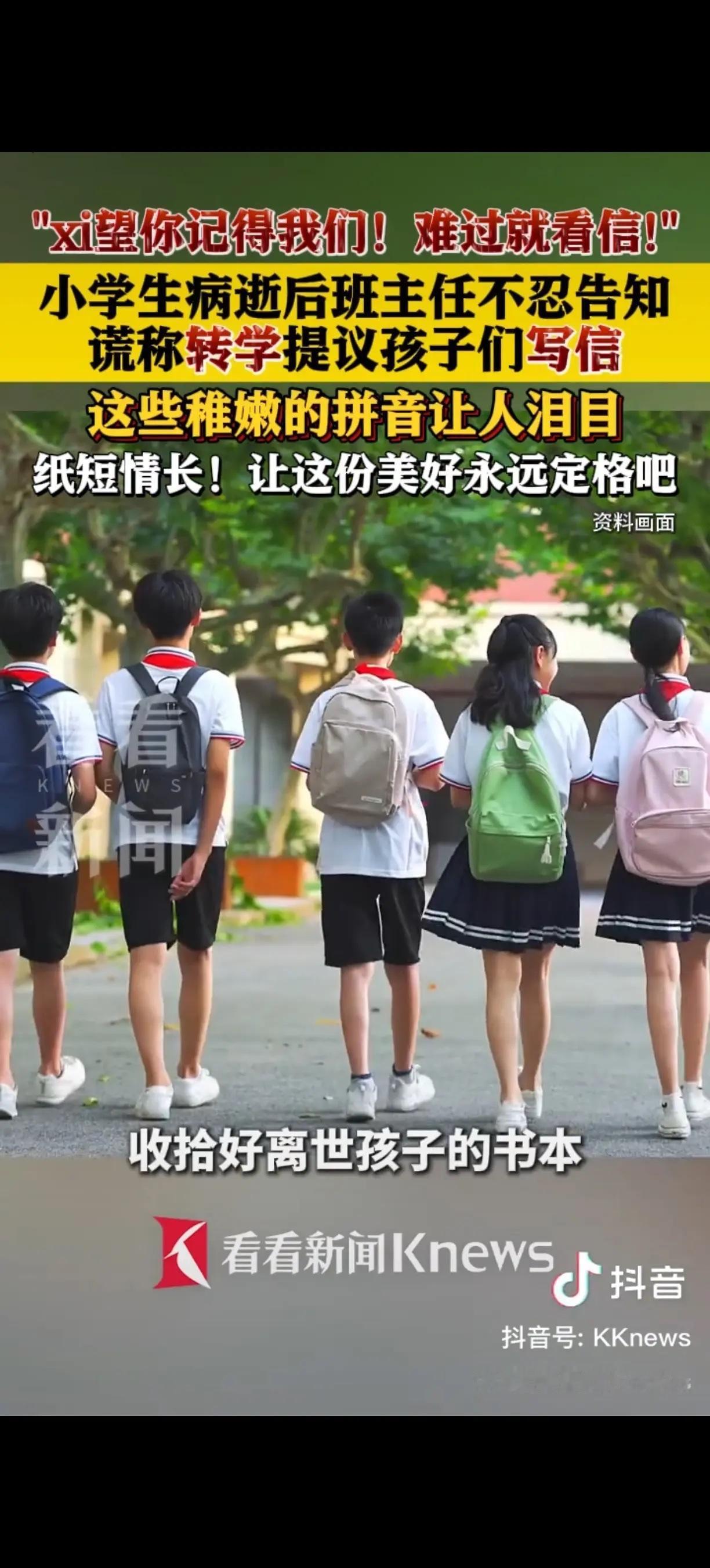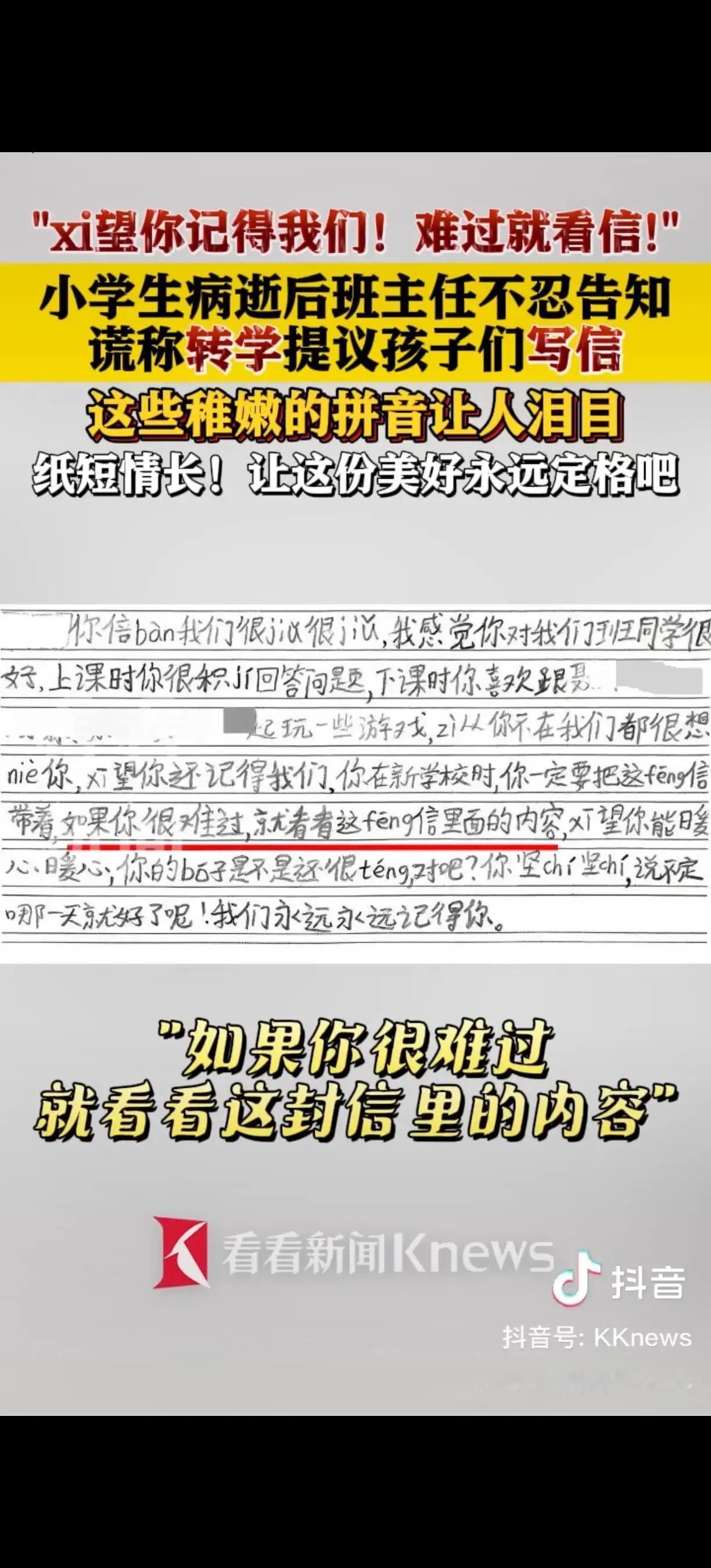 孩子突然离世,班主任哭到崩溃,可看着班里八九岁的小家伙们,实在舍不得用死亡这么残酷的事,打破他们的纯真。没办法,只能温柔地骗大家,说那个同学因为生病,转学去了很远很远的地方。老师想着让孩子们好好跟同学告别,就提议大家写封信送祝福,孩子们一听立马认真起来,心里全是对同学的惦记。 孩子们趴在课桌上,用稚嫩的拼音和歪扭的汉字写着信,有的孩子还在信里画了小红花和小星星,想让远方的同学看到开心。有个孩子写下“xī望你记得我们!难过就看信”,连“希”字都用拼音代替,却把满心的惦念写得明明白白。 还有孩子在信里问离世的同学“你的bí子是不是还很téng”,叮嘱他要“坚chí”,说说不定哪天病就好了,字里行间全是孩子式的天真和关心。这些带着拼音的信纸,每一张都戳中了老师的泪点,她捏着信,背过身偷偷擦眼泪。 等孩子们都把信交上来,老师小心翼翼地收拾好这些信,又整理了离世孩子留在教室里的书本和文具,把信件和书本放在一起,仿佛那个孩子只是暂时离开,还会回来翻开这些温暖的祝福。 老师后来把孩子们的信整理好,放在了那个孩子的书桌里,看着空荡荡的座位,心里只盼着这份纯真的善意,能成为对离世孩子最好的告慰。