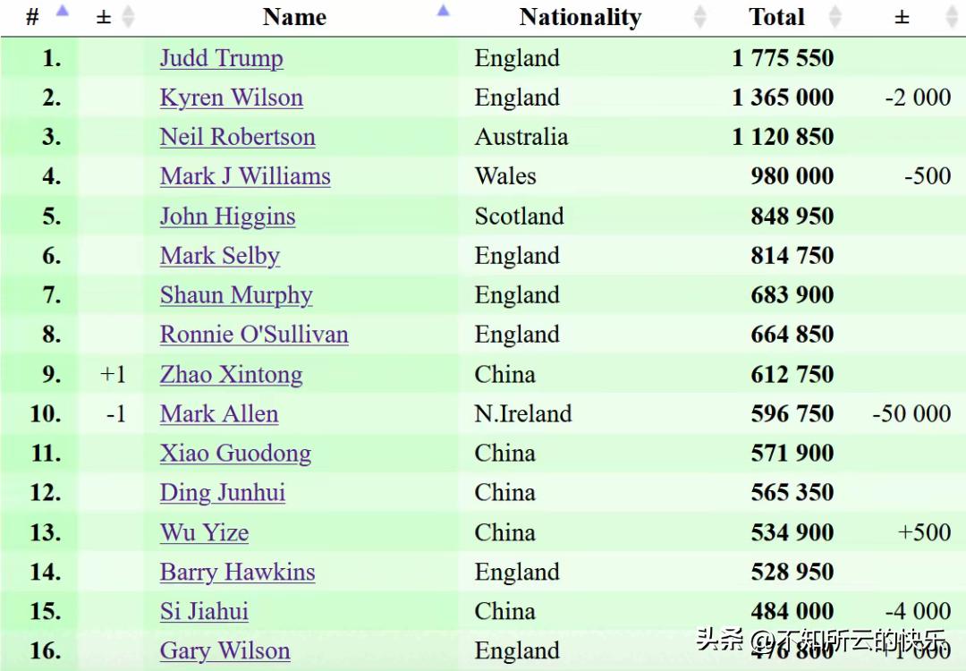 赵心童再次挺进前10,单局限时赛落下帷幕,伯顿出人意料的拿下冠军,马克艾伦首轮不敌吴安仪扣除50000积分与心童交换位置。 这一次不知赵心童能否坐稳排位,毕竟世锦赛夺冠的红利并不长久,球迷还心心念念的等着他冲击前三甚至第一。 别的目标太远,超越奥沙利文比较现实,毕竟下一站苏格兰公开赛火箭不参赛,即使不能也要接近。 前16排名上,加里威尔逊又一次迫近斯佳辉,稍有不慎再次守门不是大家想看到的,一起加油吧!