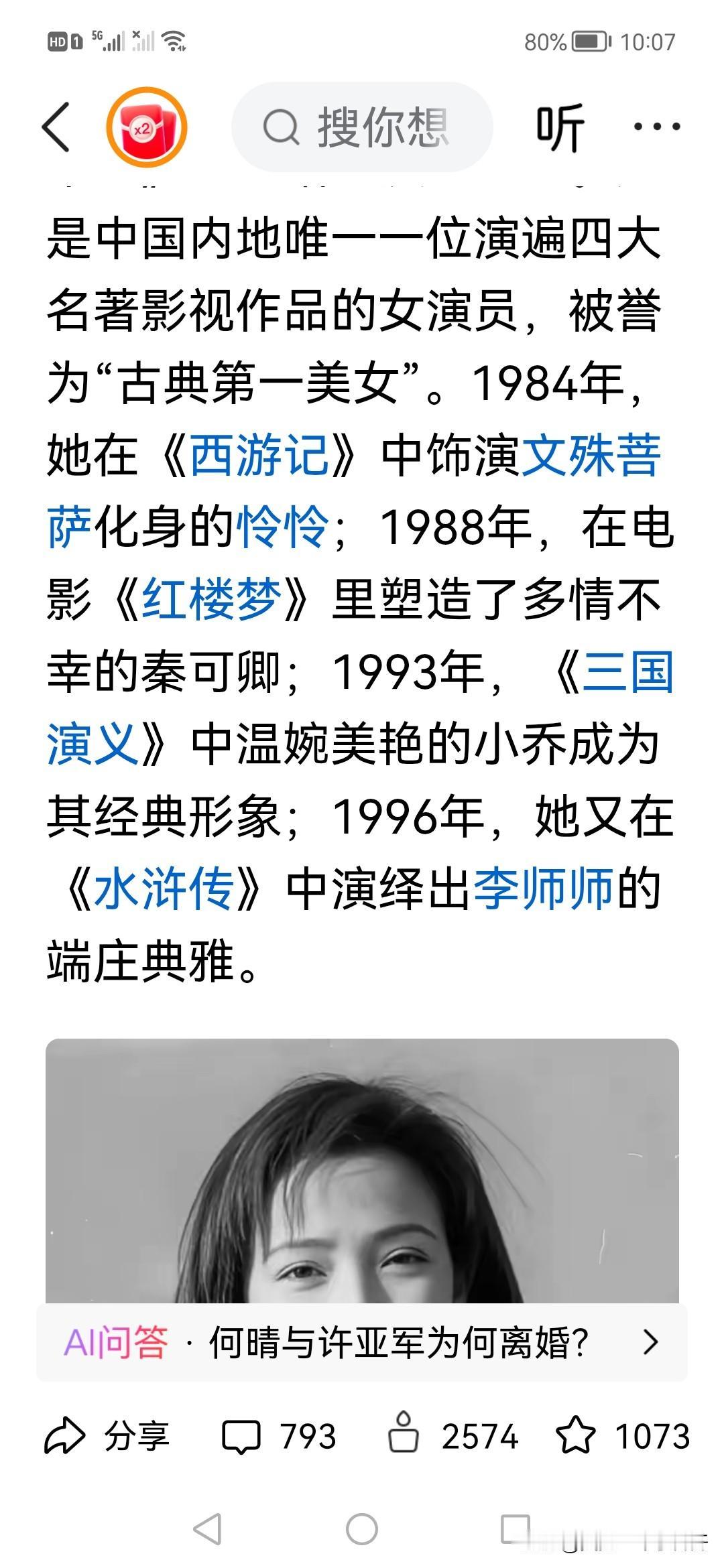 唯一一个集齐四大名著的美女演员何晴去世 《红楼梦》里秦可卿扮演的让人记忆犹新,刻骨铭心的楚楚可怜和让男同胞垂涎欲滴的一个尤物,感觉上天真是残酷,我都舍不得的美女,看着让人很养眼。 一副令人怜爱的模样,也就这几年没什么作品,怎么就突然去世了? 西游记里文殊菩萨化身的怜怜我倒是没什么印象,但是水浒传里的李师师和燕青的缠绵,两个人一起远走天涯的美好也深深刻在我脑海里,那是少年时最美好的梦! 三国里的小乔谁又能忘怀? 可惜啊可惜!上天不怜红颜! 怎么会无声无息突然就因病去世了!我们这个年龄也是风中蜡烛了! 想不到有些演员也是看一眼少一眼了!