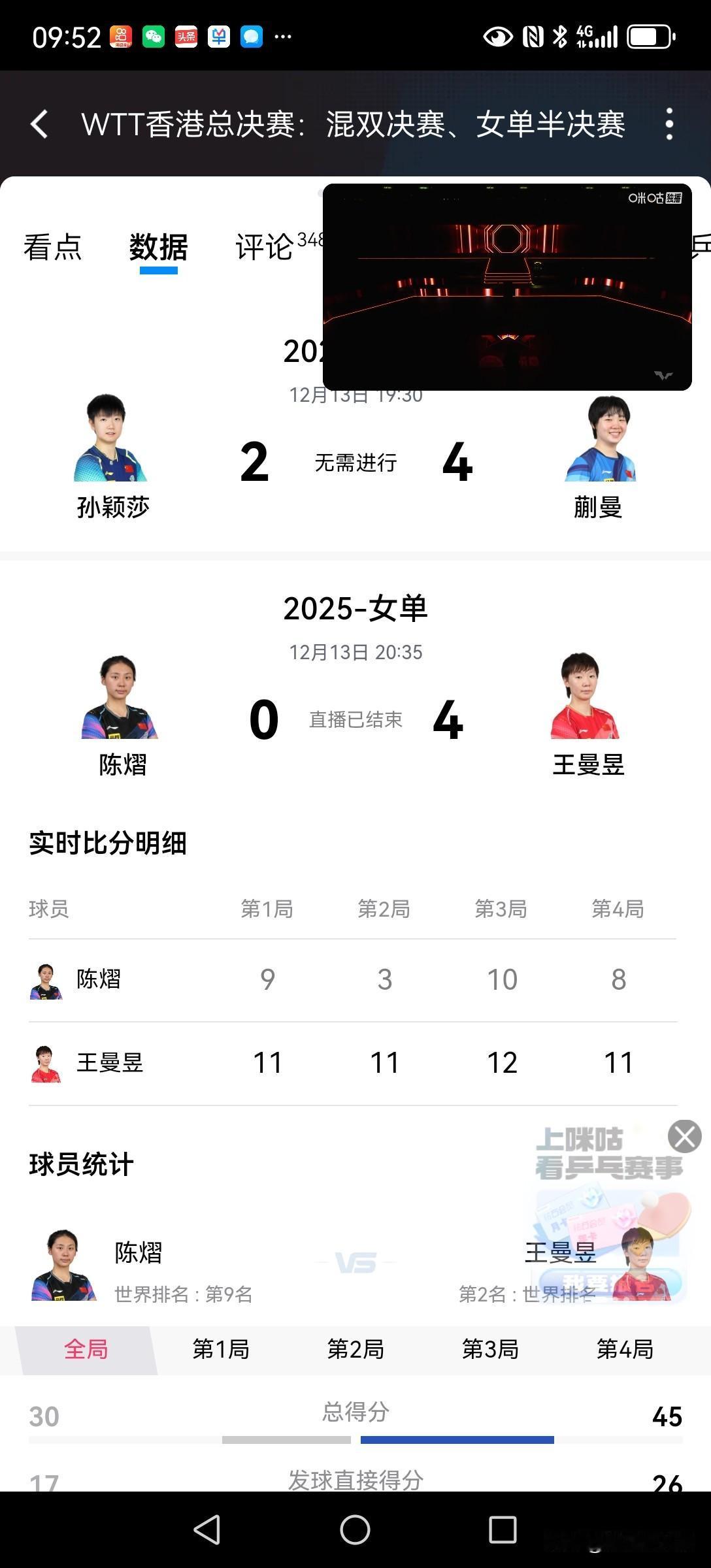 王曼昱轻松拿捏一个“亿”。 是的,香港总决赛一场女单半决赛,王曼昱轻松拿捏了一个“亿”,只不过这个“亿”是陈熠的“熠”。 王曼昱4:0陈熠: 11-9,11-3,12-10,11-8 作为陪练,陈熠能在香港总决赛打到半决赛,打到王曼昱面前,实力不容小觑。只是没能复制日本横滨冠军赛3:2逆转王曼昱的经典,说明陈熠要与曼昱抗衡,还有很长的路要走。 祝贺王曼昱晋级香港总决赛女单决赛,将与国乒小将蒯曼一争高下。 预测:王曼昱4:2蒯曼!
