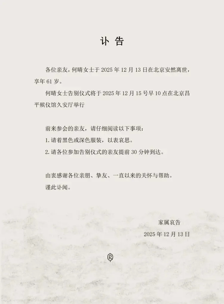 #演遍四大名著的女演员何晴去世#【著名演员何晴去世,享年61岁】#演员何晴去世#12月13日,著名演员何晴家属发布讣告显示,何晴在北京安然离世,享年61岁。证实了这一消息。余泳透露,何晴生病后一直希望低调,让大家永远记住她美好的形象。表示:何晴是他在浙江昆剧团学员班学艺时的小班同学,她是唯一演遍“四大名著”的女演员,成就非凡。何晴被誉为“古典第一美女”,曾在《西游记》中饰演怜怜,在电影《红楼梦》中饰演秦可卿,在《三国演义》中饰演小乔,在《水浒传》中饰演李师师。告别仪式将于2025年12月15日早10点在北京昌平殡仪馆久安厅举行。