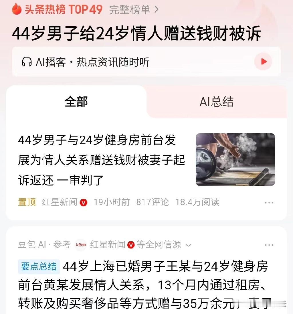 上海,24岁女子在健身房做前台,知道44岁男子已婚,仍和他发生关系,两人还在外面租房住,男子每晚不敢夜宿,直接回家,但男子陆续给女子花了46万多,16个月后,原配发现二人不正当关系后,起诉到法院,要求女子返还467913元,庭审时,男子翻脸比翻书还快,站在妻子这边把该说的、不该说的都说了,法院判决令人唏嘘。网友:这渣 男也真是没脸,享受了别人的青春又不认账? 黄某时年24岁,来自四川达州,她一个小姑娘在上海一家健身房做前台,本可以找个好人家,可是她认识一已婚男一步走错步步错…… 2023年,黄某在上班时认识了来健身的男子王某,两人经常调笑,气氛暧昧。 王某时年44岁,其实他已有家庭,和原配结婚也有23年多了,但婚姻生活的平淡令他如饮白开水寡淡无味。 可自从遇到了24岁的黄某,她的青春活力,张扬的个性让他又有了恋爱的感觉。 而黄某和王某在接触时,已经知道他有媳妇有家庭,但是二人还是冲破了道德底线,发生了不该发生的关系。 为了维持这段见不得光的感情,王某特意在外面租了一套房子给黄某居住,也是方便两人幽会。 不过,王某也很小心,他也怕妻子发现自己名声不保,所以,他从来不在出租屋里过夜,每晚都会回家休息,还沾沾自喜以为不会被发现。 王某和黄某偷偷恋爱,如胶似漆,她叫他老公,他和黄某微信聊天时也一口一个老公怎么怎么样,简直亲密的不得了。 而王某为了哄小女友黄某开心,陆陆续续给她买奢侈品包包,鞋子,手镯还时不时给她钱,在16个月的时间里他给黄某花了46万多。 然而,纸包不住火王某和黄某的事情还是被原配魏某发现了。 魏某作为原配妻子,自然无法忍受丈夫的背叛,但是冷静下来后,她明白丈夫在黄某身上花的每一分钱都是他们夫妻共同财产,必须得要回来。 于是,魏某一纸诉状将王某、黄某起诉到法院,要求黄某返还467913元。 谁也没想到,庭审时,王某翻脸比翻书还快,把和黄某的事交代个清清楚楚明明白白,该说的不该说的都说了。 还把他给黄某花的钱、送的东西列了个清单以及两人的聊天记录都交给了妻子查看,想以此表明自己改正错误的决心。 法院认为,根据《民法典》第153条规定:违背公序良俗的民事法律行为无效。 王某在与原配魏某婚姻存续期间,没有和妻子商量,就给第三者黄某大额转账,购买奢侈品。 而且,结合王某和黄某之间相差20岁,以及,王某提供的二人沟通的录音,花费的清单,还有黄某已知王某已婚情况,再加上黄某也没有合理收取王某财物的理由。 因此,法院认为,王某给黄某转账的财物因为违反公序良俗无效。 黄某应该返还相应款项。 有人问,怎么就无效呢?主要是按照所谓的夫妻共同财产吧?既然是共同财产,丈夫也拥有一半使用权,那至少一半有效吧? 家庭财产是夫妻双方共有的,一人一半对吗?那男方赠予的一半是否该归第三者呢?有什么法理依据。 从法律方面来说,夫妻共同财产,如工资、投资收益等,虽归双方共同所有,但“平等处理权”就意味着重大财产处分需夫妻双方协商一致,而非一方可擅自决定。 本案中,王某未经妻子魏某同意,将35万余元赠与情人黄某,属于单方擅自处分夫妻共同财产,侵犯了原配魏某的财产权益。 黄某作为成年人,明知王某已婚仍与其发展情人关系,并接受大额财物,主观上存在过错,不构成“善意第三人”。 假如,允许部分返还夫妻共同财产属于丈夫的那一半留给第三者的话,可能会演变成变相鼓励通过婚外情转移财产,损害配偶利益。 所以,法院认为,夫妻共同财产需双方协商处分,王某擅自赠与黄某的行为,因违背公序良俗而无效,黄某需全额返还。 因为原配魏某要求黄某返还467913元,但是,法院最终认定黄某应返还356241元。 最终,法院判决:黄某在判决生效10日内返还魏某356241元并支付利息。 魏某负担案件受理费,财产保全费2679.66元,黄某负担8485元。 有人问,既然王某已婚,而且黄某也知道王某已婚,为什么不是重婚罪呢? 《刑法》第258条规定:有配偶而重婚的,或者明知他人有配偶而与之结婚的,处二年以下有期徒刑或者拘役。 首先,王某、黄某未满足“以夫妻名义共同生活”的要件。 根据法院查明的事实,王某虽为黄某租房、转账、购买奢侈品,但未与黄某以夫妻名义共同生活。 构成重婚罪需要有以下条件: 1、如举办婚礼、以夫妻名义参加社交活动、共同生育子女等; 2、长期稳定同居(如数年以上),而非短期交往。 但本案中,王某与黄某的关系更接近“婚外情”或“同居”,未达到重婚罪的认定标准。 而且,王某每晚回家,未在出租屋内夜宿,进一步证明双方未形成事实婚姻关系。 假如王某与黄某公开以夫妻名义同居,邻居证言、社交圈认可、共同参加家庭活动都认为他们是夫妻,则可能构成重婚罪。 对此你怎么看呢?