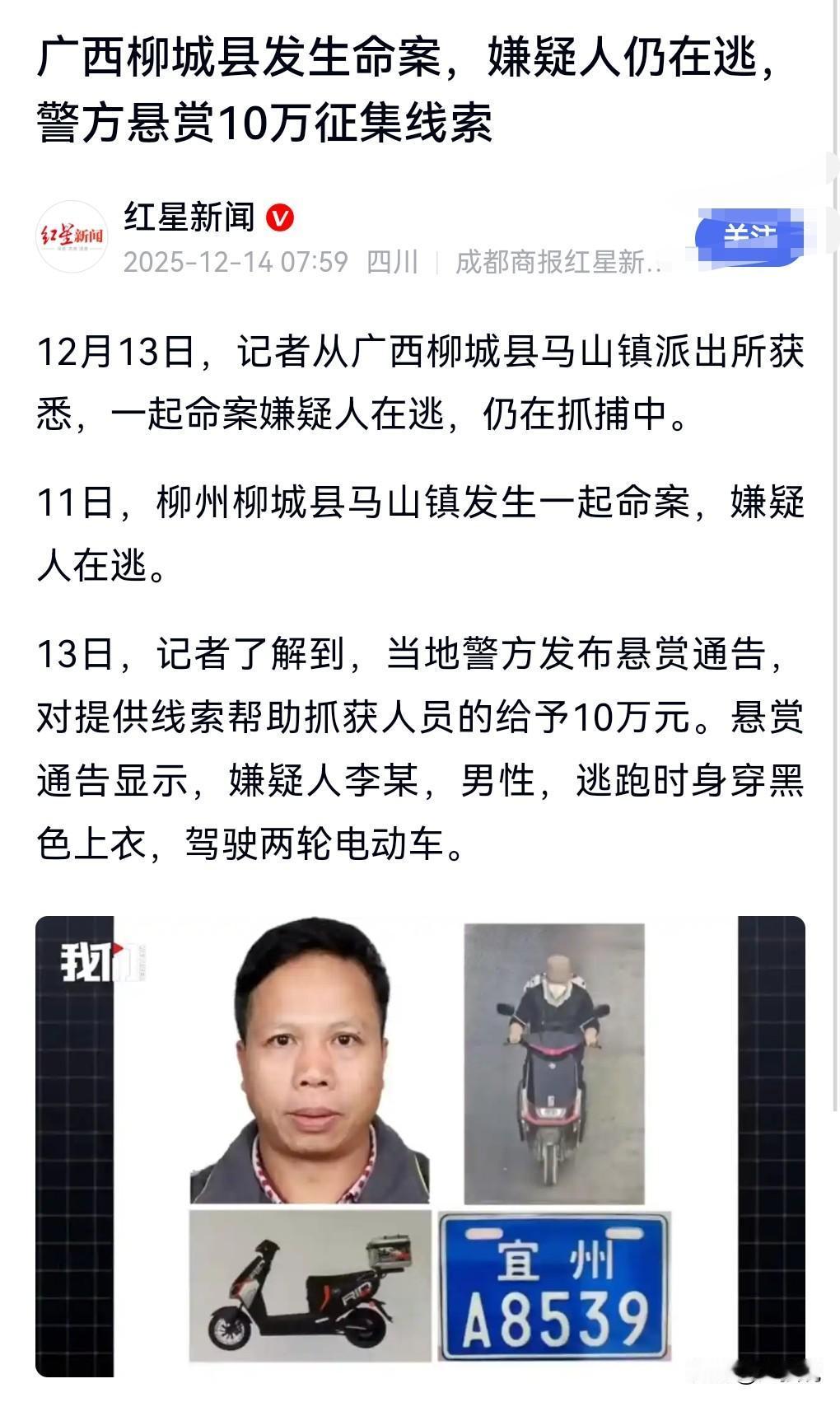 不好了,不好了。 12月11日。广西柳州柳城县马山镇发生了一起命案。 实在是太可怕了。 命案对当地治安的严重挑衅。 李某在逃。 一定要早日抓住。 能够自首是最好了。 不要有侥幸心理。 警方悬赏10万,也是相当的重视。广西发生命案 警方悬赏10万