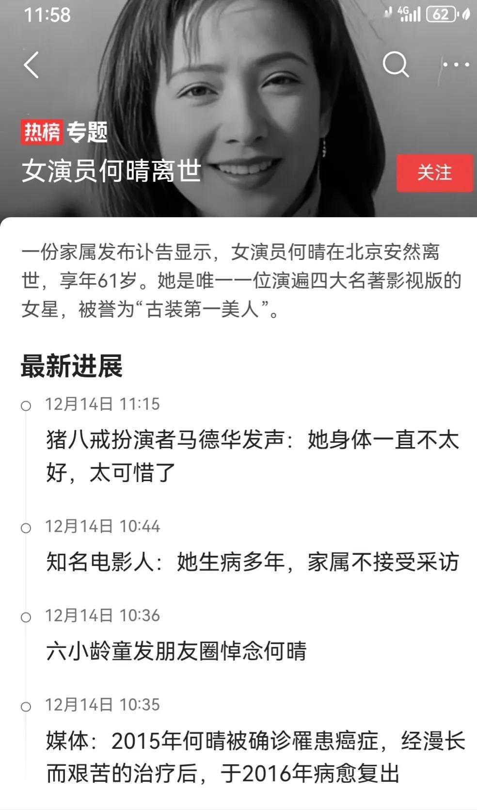 何晴安然离世, 十年前她被确诊患癌症,经治疗康复后复出。 印象中她一直都是健康阳光的。