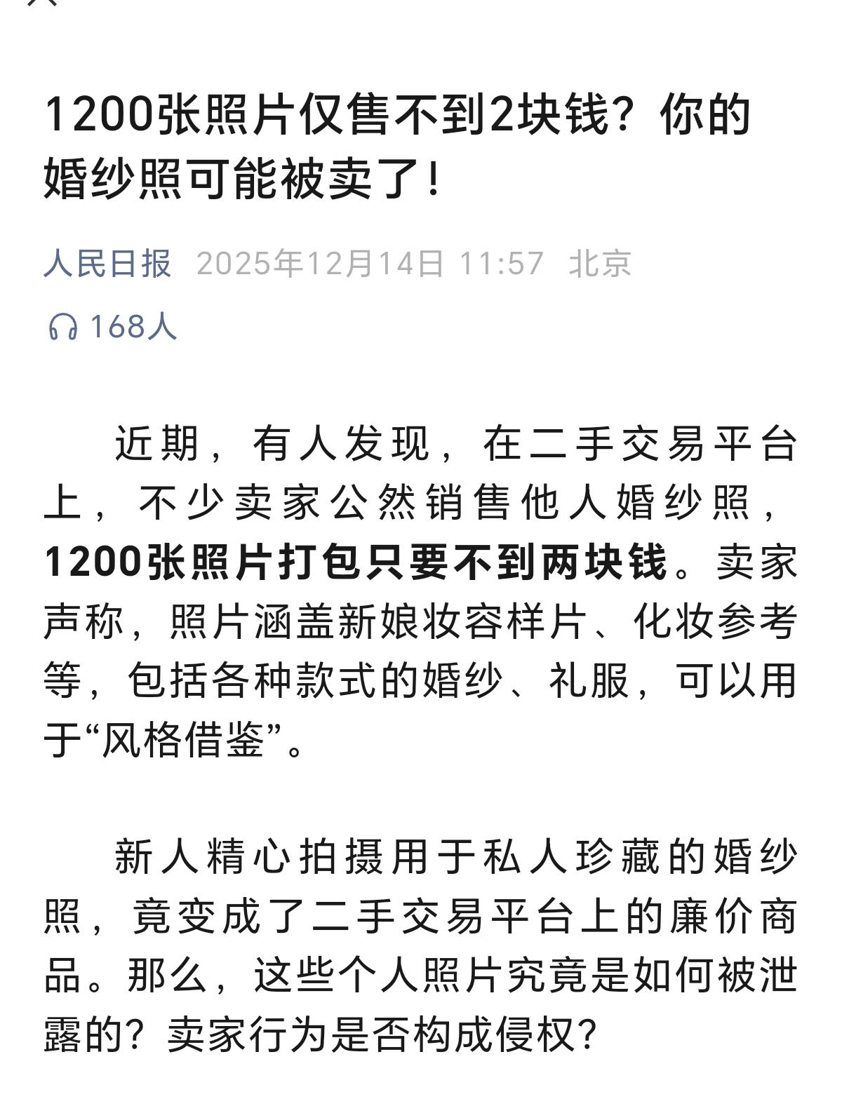 真是离谱了,居然连新娘的婚纱照,都能拿来放二手平台售卖。这些婚纱照,都是怎么得到的?这些拍摄的婚纱照,留下来的底片,是怎么上的二手平台的?这些售卖者,都是从哪里拿来的! 要不是看了人民日报的报道,我还不知道,居然连新娘的婚纱照,都有人放二手平台交易。真是离谱了!