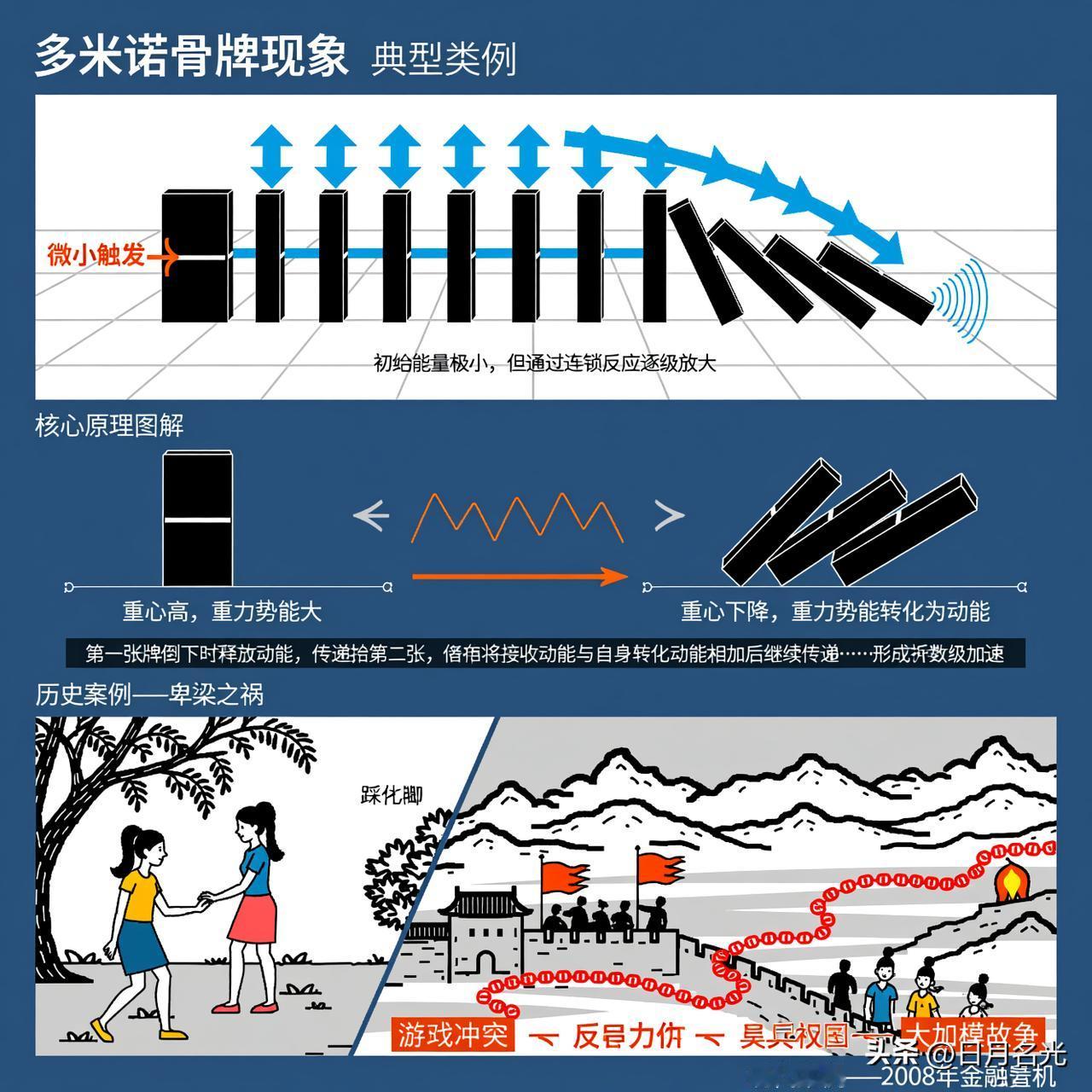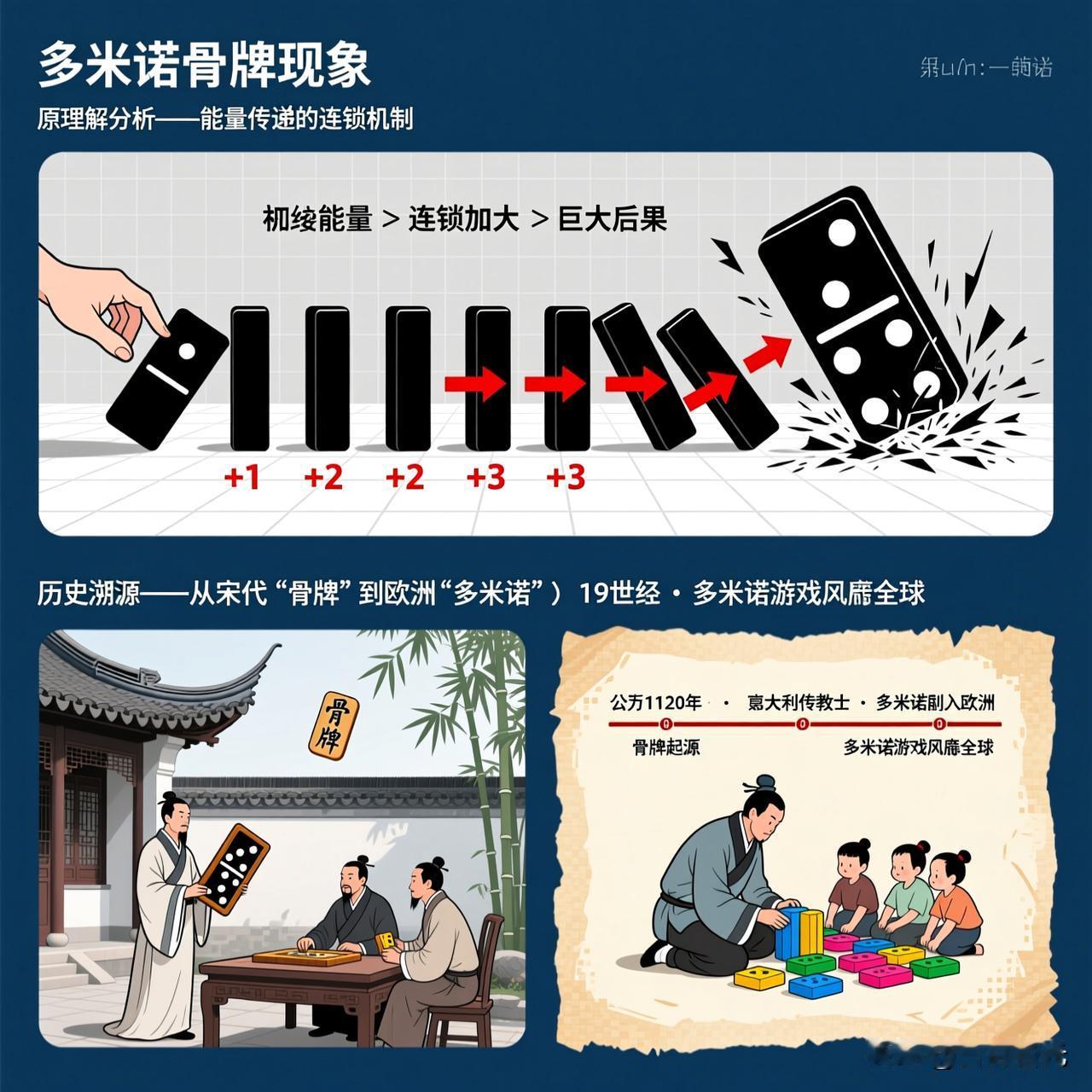 什么是多米诺骨牌现象 多米诺骨牌现象总结为微小触发引发的连锁巨变。 它的定义是:在一个相互联系的系统中,一个很小的初始能量就可能产生一系列的连锁反应,这种现象被称为"多米诺骨牌效应"。 当骨牌竖立时,重心较高;倒下时重心下降,重力势能转化为动能。第一张牌倒下时,其动能传递给第二张牌,第二张牌将接收到的动能与自身转化的动能相加后传递给第三张牌...如此循环,每张牌倒下时的动能都比前一张更大,速度也更快。 多米诺骨牌起源于中国宋代(公元1120年),最初称为"骨牌"或"牙牌"。1849年,意大利传教士多米诺将其带回欧洲,并发展出各种玩法。19世纪,这项运动已成为世界性的非奥运项目,拥有最高的知名度和最广的参与地域。 经典案例解析 1. 卑梁之祸:从游戏到战争的连锁反应 春秋时期,楚国卑梁与吴国边境的姑娘因采桑叶时的游戏冲突,最终演变为两国大规模战争。从"踩伤脚"到"攻入郢都",这一历史事件完美诠释了多米诺骨牌效应的灾难性后果。 2. 2008金融危机:金融市场的连锁崩溃 美国次贷危机引发的全球金融危机,从"次级房贷"产品贬值开始,通过CDS、掉期等金融衍生品层层传导,最终导致美林破产、AIG危机,形成典型的金融多米诺效应。 就像推倒第一块骨牌只需要轻轻一碰,人生中那些看似微不足道的选择,往往就是改变命运的起点。