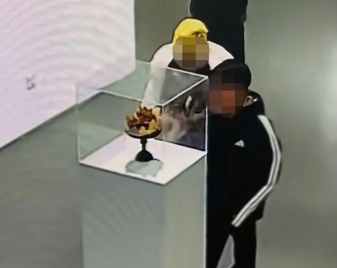 4斤黄金凤冠展出时被毁谁来赔: 我感觉小孩好像哈到哈气了.想用手去擦一下然后罩子