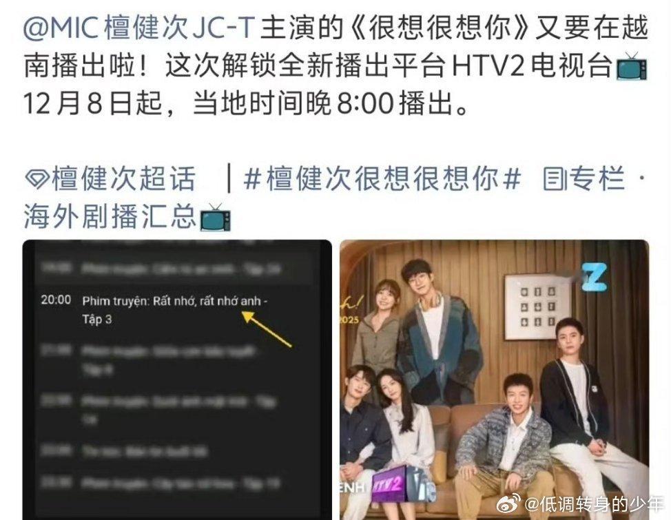 檀健次《很想很想你》12月8日将在越南HTV2 电视台当地时间晚8:00播出。这是《很想很想你》第20次中国大陆以外地区播出