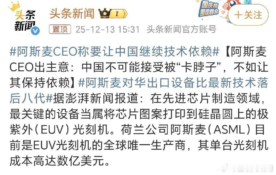 荷兰的阿斯麦还挺阴险的,其CEO称要让中国继续技术依赖!在最新专访中阿斯麦的CE