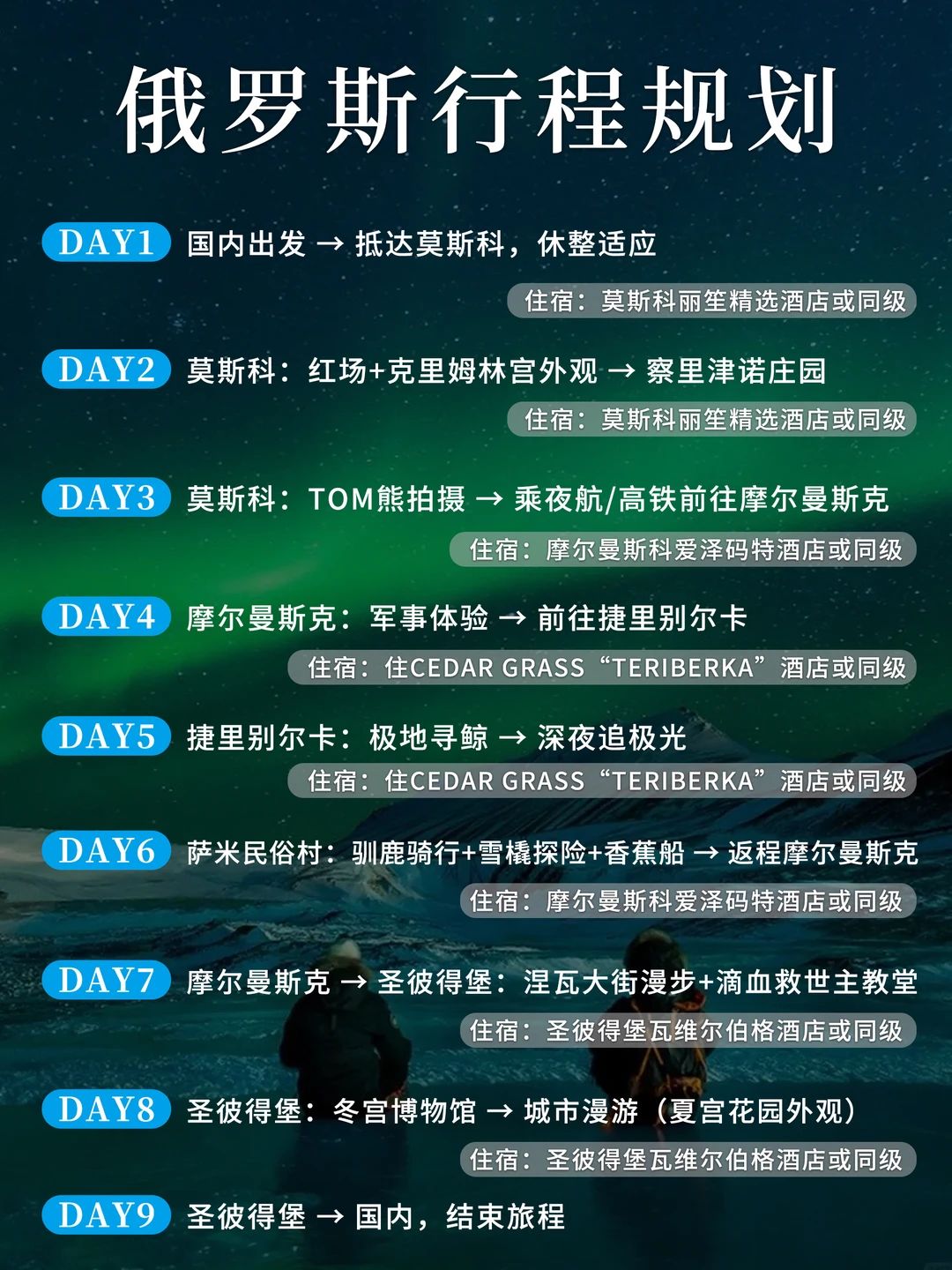 💡想要解锁一次“战斗名族”的硬核浪漫? 9天的俄式狂欢它来了! 从莫斯科红场的庄严到克里姆林宫的霸气,再冲摩尔曼斯克追极光、捷里别尔卡寻鲸🐳,还有驯鹿🦌骑行、军事体验超嗨项目! 冷门热景全拿捏,快收拾行李🧳,赴一场俄式奇遇吧! 📍D1:国内启程奔赴莫斯科,跨越时区抵达后,卸下旅途疲惫,在这座东欧名城悠闲休整,为后续旅程蓄力 📍D2:打卡莫斯科核心地标,感受历史厚重,远观克里姆林宫庄严轮廓;午后前往察里津诺庄园,在田园风光与古典建筑中,解锁惬意慢时光 📍D3:在莫斯科TOM熊🐻开启趣味拍摄,定格鲜活瞬间;随后乘夜航✈️或高铁🚅奔赴摩尔曼斯克,在移动中期待极地的奇幻相遇✨ 📍D4:摩尔曼斯克解锁硬核军事体验,感受铁血豪情;之后前往捷里别尔卡,奔赴北极圈边缘的小村落,邂逅纯粹极地景致 📍D5:捷里别尔卡开启极地寻鲸🐳之旅,深夜静待极光降临,在璀璨星河🌌下,邂逅欧若拉的梦幻光影 📍D6:走进萨米民俗村,体验驯鹿🦌骑行,雪橇探险的刺激与香蕉船🛶的欢乐,深度感受极地住民文化;之后返程摩尔曼斯克 📍D7:从摩尔曼斯克前往圣彼得堡,漫步涅瓦大街感受文艺氛围,探访滴血救世主教堂⛪️,在绚丽建筑中触摸城市的宗教与艺术底蕴 📍D8:冬宫博物馆,饱览世界艺术瑰宝;午后城市漫游,远观夏宫花园⛲️的恢弘景致,感受圣彼得堡“北方威尼斯”的独特韵味 📍D9:告别圣彼得堡,搭乘航班返程国内,满载俄罗斯从城市历史到民俗风情圆满结束旅程🔚 🌟行程规划|可调整 📍D1:国内出发 → 抵达莫斯科,休整适应 📍D2:莫斯科:红场+克里姆林宫外观 → 察里津诺庄园 📍D3:莫斯科:TOM熊拍摄 → 乘夜航/高铁前往摩尔曼斯克 📍D4:摩尔曼斯克:军事体验 → 前往捷里别尔卡 📍D5:捷里别尔卡:极地寻鲸 → 深夜追极光 📍D6:萨米民俗村:驯鹿骑行+雪橇探险+香蕉船 → 返程摩尔曼斯克 📍D7:摩尔曼斯克 → 圣彼得堡:涅瓦大街漫步+滴血救世主教堂 📍D8:圣彼得堡:冬宫博物馆 → 城市漫游(夏宫花园外观) 📍D9:圣彼得堡 → 国内,结束旅程 💡如何定制? 在评论区留言,或后台发送【人数+出发日期】小编 会在D一时间回复✅