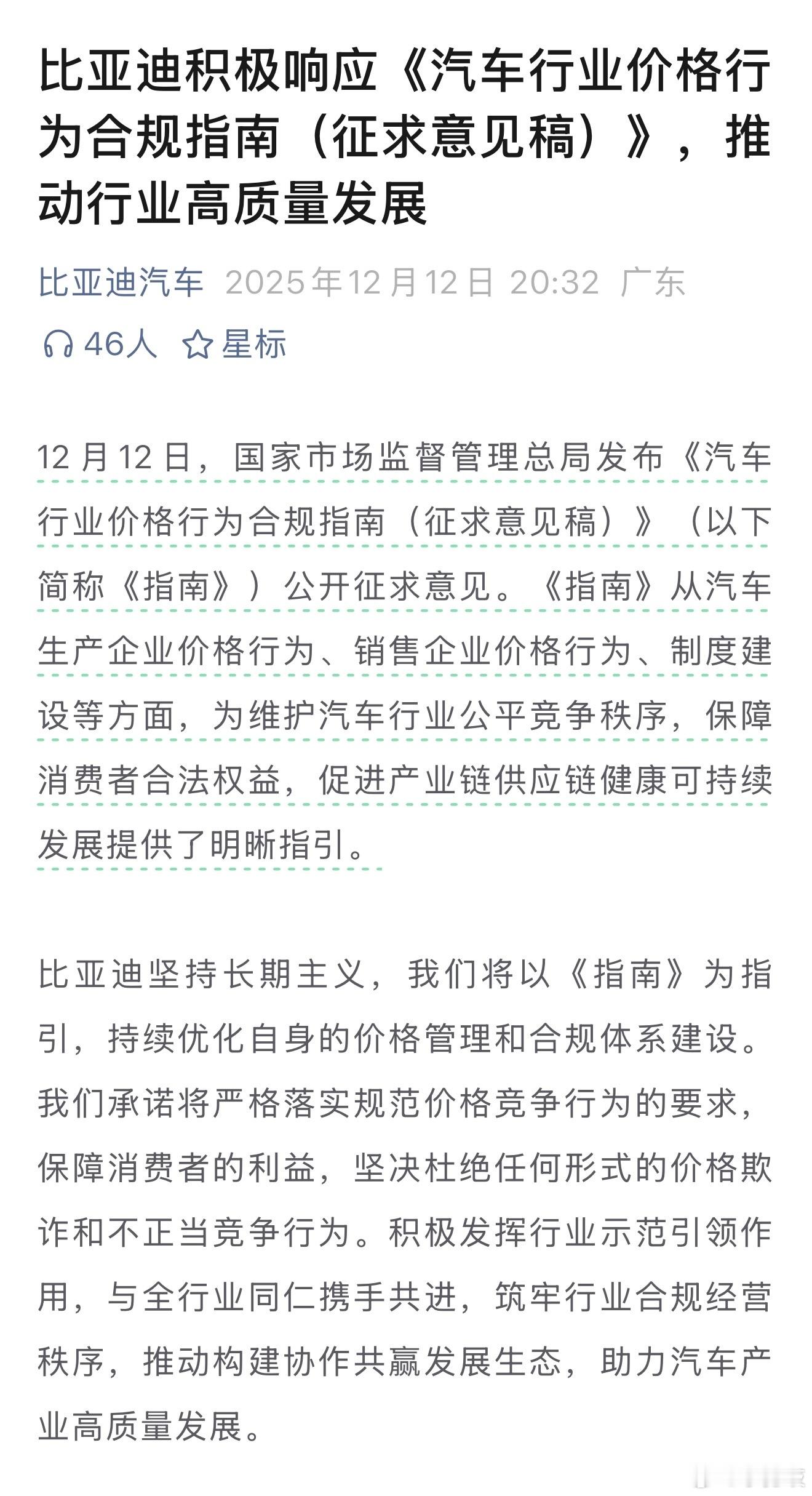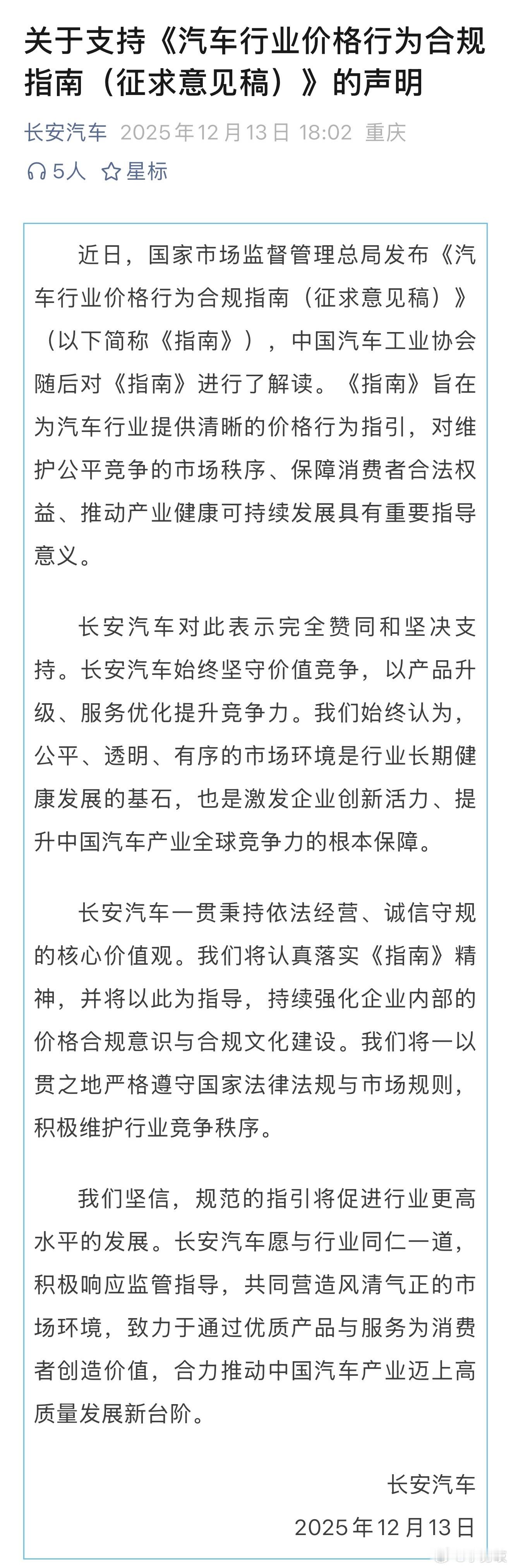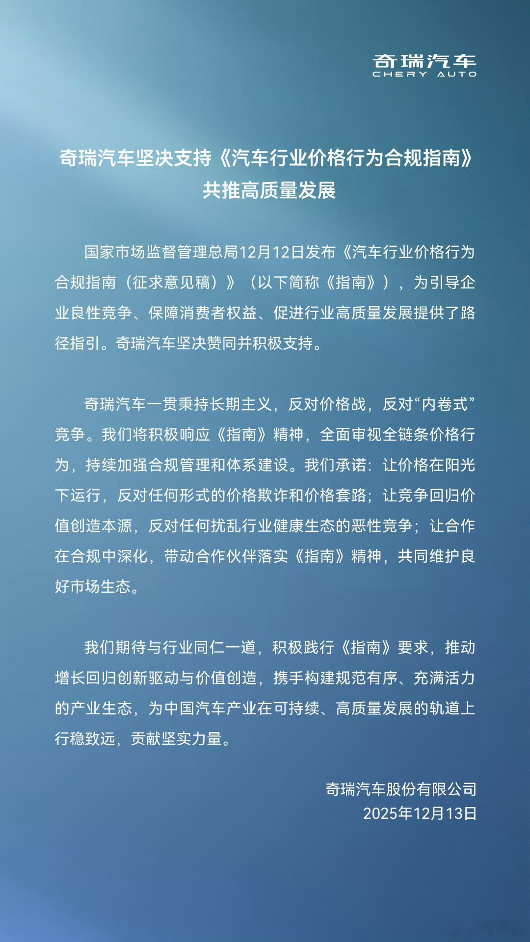 反对价格战!零跑/小鹏/比亚迪/长安/奇瑞/长城等多家车企回应国家发文禁止亏本卖车日前,国家市场监督管理总局就《汽车行业价格行为合规指南(征求意见稿)》公开征求意见,为汽车行业提供清晰的价格行为指引,对维护公平竞争的市场秩序、保障消费者合法权益、推动产业健康可持续发展具有重要指导意义。对此,零跑、小鹏、比亚迪、长安、奇瑞、北汽、长城等多家车企回应表示支持。零跑汽车表示,将积极响应《汽车行业价格行为合规指南》。坚守合规底线,践行公平竞争,杜绝任何形式的价格欺诈和不正当竞争行为,与行业同仁共筑健康生态,推动中国汽车产业高质量发展。小鹏汽车回应,始终坚信,企业的长远发展根植于对规则的尊重和对用户的诚信。全面审视并持续优化自身价格管理与合规体系,确保从产品定价到销售服务的每一个环节都更加透明、规范。承诺将严格遵守明码标价原则,保障消费者的知情权与选择权,坚决杜绝任何形式的价格欺诈与不正当竞争行为。比亚迪称会持续优化自身价格管理和合规体系建设,承诺将严格规范价格竞争行为的要求,保障消费者的利益,坚决杜绝任何形式的价格欺诈和不正当竞争行为。奇瑞指出反对价格战,反对“内卷式”竞争,全面审视全链条价格行为,持续加强合规管理和体系建设。奇瑞承诺让价格在阳光下运行,反对任何形式的价格欺诈和价格套路;让竞争回归价值创造本源,反对任何扰乱行业健康生态的恶性竞争;让合作在合规中深化,带动合作伙伴落实《指南》精神,共同维护良好市场生态。长城汽车承诺严守合规底线,全面审视并持续强化内部价格合规管理体系建设,将合规要求深度融入产品定价、销售推广、渠道管理等全业务流程。严格执行明码标价,坚决杜绝低于成本价倾销、价格欺诈、虚假宣传等一切违法违规行为,保障消费者合法权益。坚持诚信经营,反对以牺牲质量与安全为代价的低水平价格战,并一直积极呼吁行业禁止恶性竞争。