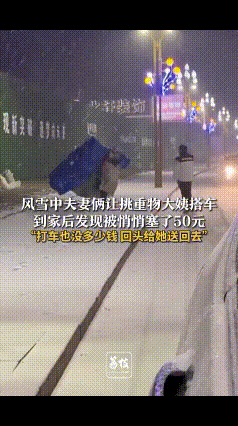 “打车也没多少钱,回头给她送回去。”辽宁抚顺,夫妻俩开车回家时,发现路边有个大姨挑着重物艰难前行,本来车已经开过去了,但男子放心不下,于是夫妻俩又折返送大姨回家,事后却发现大姨偷偷塞了50元钱。 12月11日,辽宁抚顺,东北的夜晚寒风刺骨,夫妻俩开着小轿车回家的路上,驾驶车辆的男子无意间一瞥,看到路边有位大姨独自一人挑着重物艰难前行,男子回神的功夫,车已经开过去了,但男子心里越想越难受,就和妻子说:“这么冷的天,又刚下了一场大雪,路面又湿又滑,这大姨得走到什么时候才能到家啊。” 男子一边说一边就已经把车开回去了,把车停到大姨身边后,大姨本能的警惕起来,男子夫妻俩下车后,男子连忙说自己是因为担心大姨一个人扛着重物回家不容易,想帮一把。听到夫妻俩的来意后,大姨这才放下心来。 大姨本不想麻烦男子,但架不住男子夫妻俩热情相帮的态度,又想到天这么冷,自己独自走回家确实也需要很长时间,于是大姨便接受了夫妻俩的好意,上了车。 因为大姨的东西后备箱装不下,男子便把车的整个后座都放倒了,以此来方便把大姨的物品完好无损的装上车。夫妻俩把大姨送到她家楼下后,还帮着大姨把东西整理好抬出,大姨感激的向心善的夫妻俩不断道谢。 后来男子回家后在整理后座的时候,却意外发现车里留下50块钱,男子拿着这50块钱,知道这肯定是大姨偷偷留下的。男子说其实打车也没多少钱,大姨不选择打车肯定是想省钱,如今却给自己塞了50块钱,心里越想越不是滋味。 幸好是在路上聊天时,男子听大姨说过她每天做工的地方,于是男子说明天下班时一定要把这50元钱还给大姨,自己决不能好心办坏事,给大姨多增加负担。 善良遇上了感恩,男子看到在冬夜里独自前行的大姨,不怕麻烦也要返回帮忙;大姨接受好意后,也不忘感激之心,偷偷塞钱报答。双向奔赴的好人们,共同谱成一段美好温馨的故事。 爱出者爱返,福往者福来。祝愿好人都能一生平安顺遂!