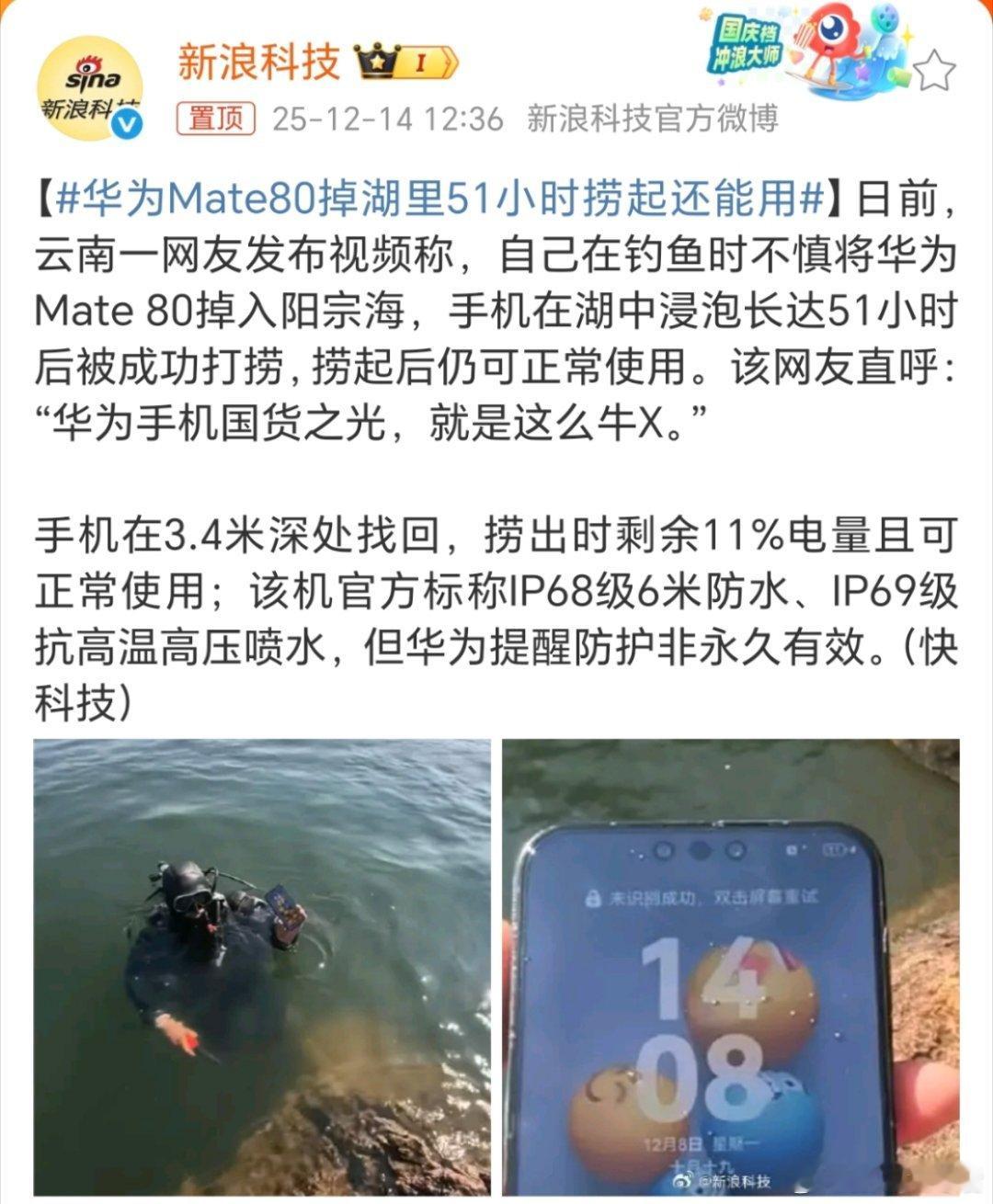 华为Mate80掉湖里51小时捞起还能用 还得是支持支持IP68、IP69防水的手机,掉水里真能保手机一命,但没想到华为Mate80在水里泡51个小时都没事,而且还有电!