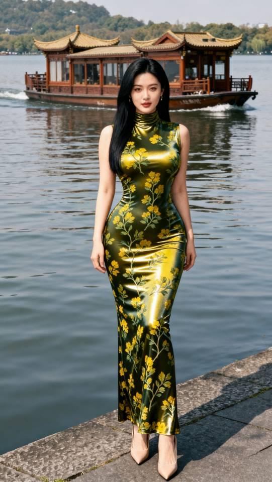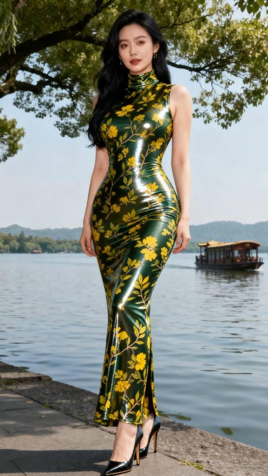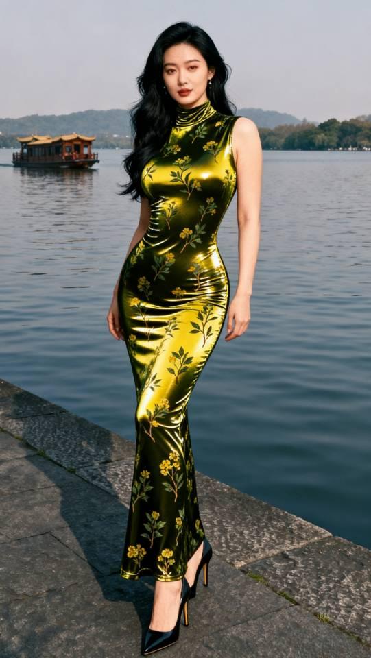 绿花连衣裙女子湖边写真。连衣裙 美女壁纸