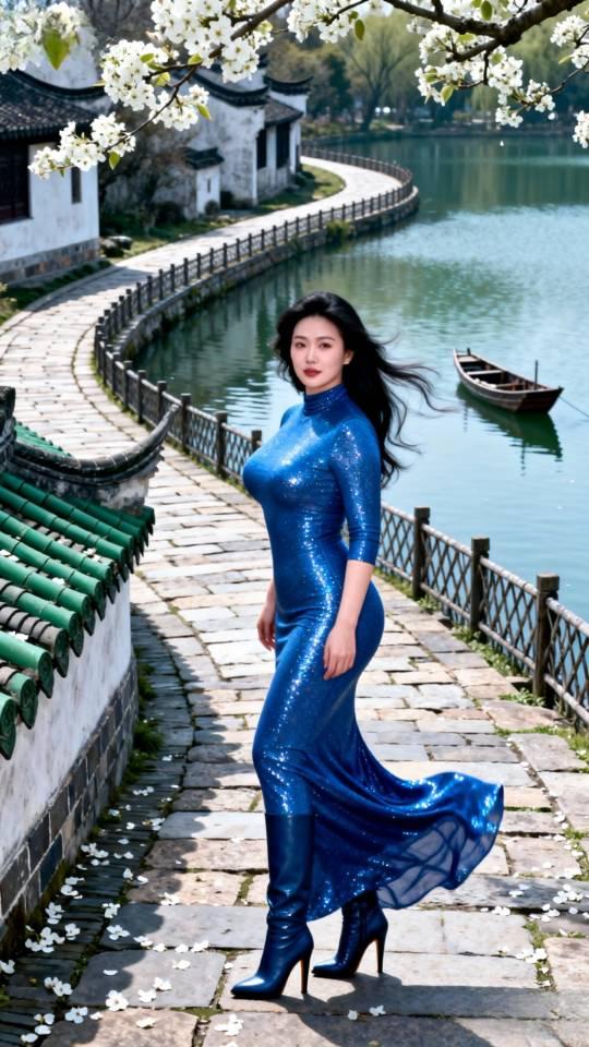 身穿蓝色连衣裙的微胖女子。连衣裙 气质蓝色连衣裙 长裙微胖穿搭