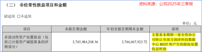 报表显示,在第三季度,润泽科技将一家全资孙公司转让至南方润泽科技数据中心REIT,产生非流动性资产处置损益37.45亿元。