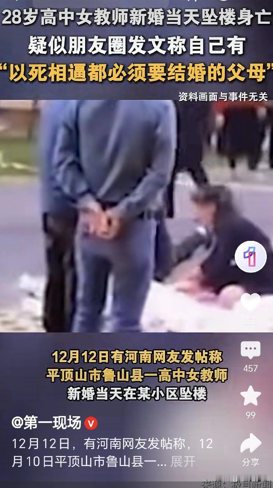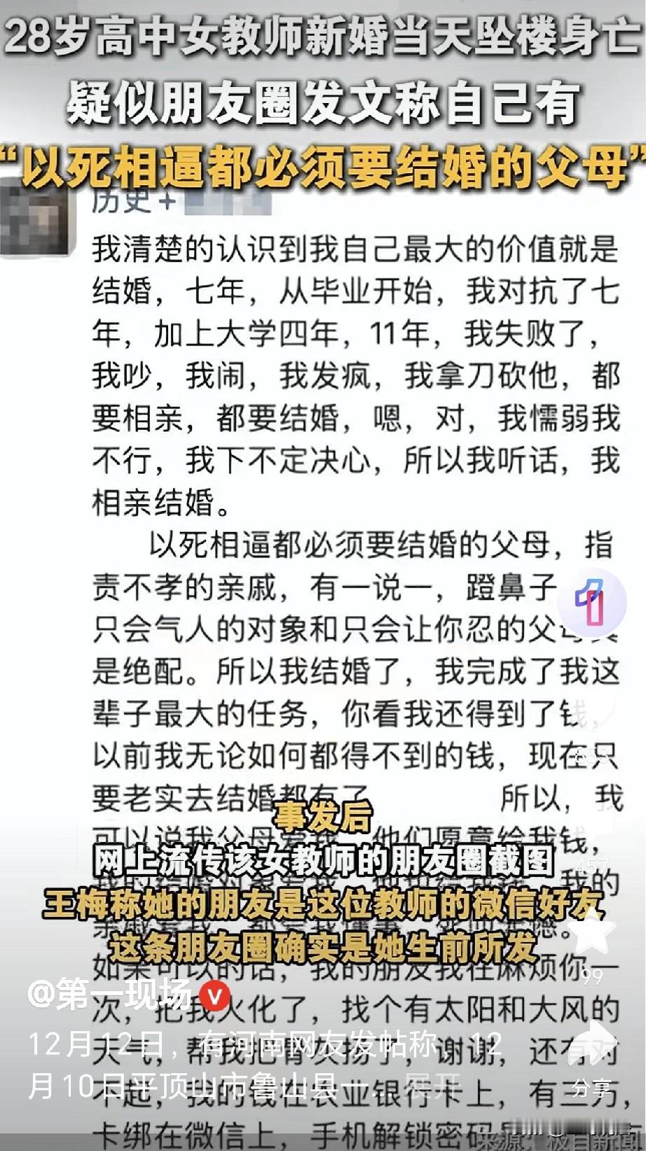 悲剧!河南平顶山,一28岁女教师发朋友圈,父母以死相逼,要她相亲结婚,她哭她闹,亲戚说她不孝,她妥协了,找了个对象,对象蹬鼻子上脸,只会气她,父母不但不管,还要她忍耐,女子妥协,她恨自己懦弱,女子举办了婚礼,婚礼当天,女子登上7楼,她一跃而下: 我最大的价值就是结婚,完成任务了,死而无憾,希望朋友能将她的骨灰扬了…… 一女子在一所中学当女教师,她不但长得漂亮,为人也是十分的善良,她有编制,工作稳定,这个条件,让人十分的向往。 女子的父母,以女子为荣,经常把女儿挂在嘴上,在亲戚朋友跟前提及,更得意洋洋。 女子从小到大,父母尽心的养育栽培,女子聪慧懂事,学习成绩名列前茅。 她一路顺利,以优异的成绩考上了大学,大学四年,父母开启了催婚之路。 父母认为,女大当嫁,女子嫁人,是天下第一要务,只有结婚,才是人生最大的赢家。 女子在大学四年,依旧勤奋上进,她年龄还小,再加上住校,可以成功避开父母的唠叨。 可是四年时间,转眼即逝,女子成功应聘到一家优秀的高中,担任了一名高中教师,她每天上课下课,接触的都是学生们的单纯灿烂。 她想工作,不想考虑个人问题,她还年轻,不想去考虑结婚生子。 可父母闲不住了,既然你已经完成了学业,并且已经参加了工作。 如此一来,就该到了谈婚论嫁的时候,不能熬到年纪大了,到时候就没人要了。 女子不以为然,每当父母安排她相亲见面,她又哭又闹,坚决反对,她不想结婚,就喜欢一个人简单生活。 随着时间的推移,父母的催婚越演越烈,他们四处张罗,通知亲朋好友,一定要给女子找个好的对象。 可女子坚持己见,绝不相亲,也不恋爱,结婚更不可能,她坚持自己的意见。 谁知父母不肯罢休,他们发动亲戚,都来给女子做思想工作。 女子连连摇头,我不想结婚,我就想自己生活,我要安静,我喜欢自己待着。 父母不愿意了,你不结婚是吧,我们把你养大,你学会不听父母的话,自古以来,女大当嫁,你不结婚,我们的老脸往哪里搁? 你不结婚,我们就没法活了!母亲哭的一把鼻涕一把泪的,父亲唉声叹气,我怎么生了这样的女儿! 亲戚们加油添醋,你看你把父母气成这样?女大当婚,天经地义,你不结婚,就是不孝! 父母养你长这么大,你读书有成,现在就是你报答父母的时候,再说,你不结婚,你老了咋办? 父母要你结婚,根本就是爱你疼你,怕你将来,年纪大了,一个人孤单,等父母老了,你就无依无靠。 甚至你有病有灾,连个倒水照顾的人都没有…… 女子以泪洗面,我不过就是要保持单身,何至于担上不孝的罪名? 可父母要死要活,你再不结婚我们就死给你看! 女子最后一道防线,彻底垮了,她知道父母疼她,爱她,她也明白,她不结婚,将会永远受到指责。 她就不明白了,她不结婚,跟别人有何干系?她的一生,难道就不能自己选择? 她摇摆不定,在父母胁迫之下,她选择了妥协,眼泪夺眶而出。 她回想起上大学以来,她抗争了11年,还是没能抗住世俗的压力。 事到如今,她不结婚就对不起所有的人,难道自己的坚守错了?自己不该有自己的生活! 她心里矛盾,一边妥协着前去相亲,一边骂自己懦弱,怎么可以就这样没有原则? 相亲的对象她不喜欢,可爹妈看上,对象给她钱花,开始对她相当不错。 她心如死灰,此生就这样了,她同意结婚,父母看她改变,给她钱花。 女子感到,也许父母和对象都很爱她,亲戚们也满意了。 唯独自己的悲伤如炬,烧的自己不想活了,她感觉自己最大的价值,不过就是结婚而已。 她的学习,她的奋斗,她的工作,她做出的种种的成绩,在父母眼里,都不重要。 她保持单身,独立幸福,她心满意足,可是在父母亲戚们看来,她大逆不道! 对象看她接受了自己,蹬鼻子上脸,和她生气,女子受不了了,回家告诉父母,可父母不但不正视问题,反而要她忍一忍就算过去。 女子绝望,她在朋友圈发布了消息: 我懦弱,我不行,我下不定决心,所以我听话,我相亲结婚…… ……如果可以的话,我的朋友我再麻烦你一下,把我火化了,帮我把骨灰扬了…… 12月10日,女子如期举办了婚礼,随后,她长舒了一口气,终于完成了任务了。 她登上7楼,看到一楼有个院子,她有些害怕: 对不起了,我只找到这样的机会…… 女儿一跃而下,当场摔死,12月11号,女子被送到了殡仪馆火化。 不知她的父母作何感想,亲戚们可曾后悔对她的道 德绑架?强扭的瓜不会甜的,留下的是一生的悔恨。 《民法典》第1046条规定: 结婚应当男女双方完全自愿,禁止任何一方对另一方加以强迫,禁止任何组织或者个人加以干涉。 女子父母以死相逼、亲戚道德绑架,迫使她违背意愿结婚。 父母以死相逼,是悲剧的重要原因,亲情不应成为干涉自由的枷锁。 父母应尊重女儿的想法,她虽然是父母的女儿,但她是个个体,有自己的想法,尊重才是最好的选择。 关注@王哥说法 多学法律少吃亏!