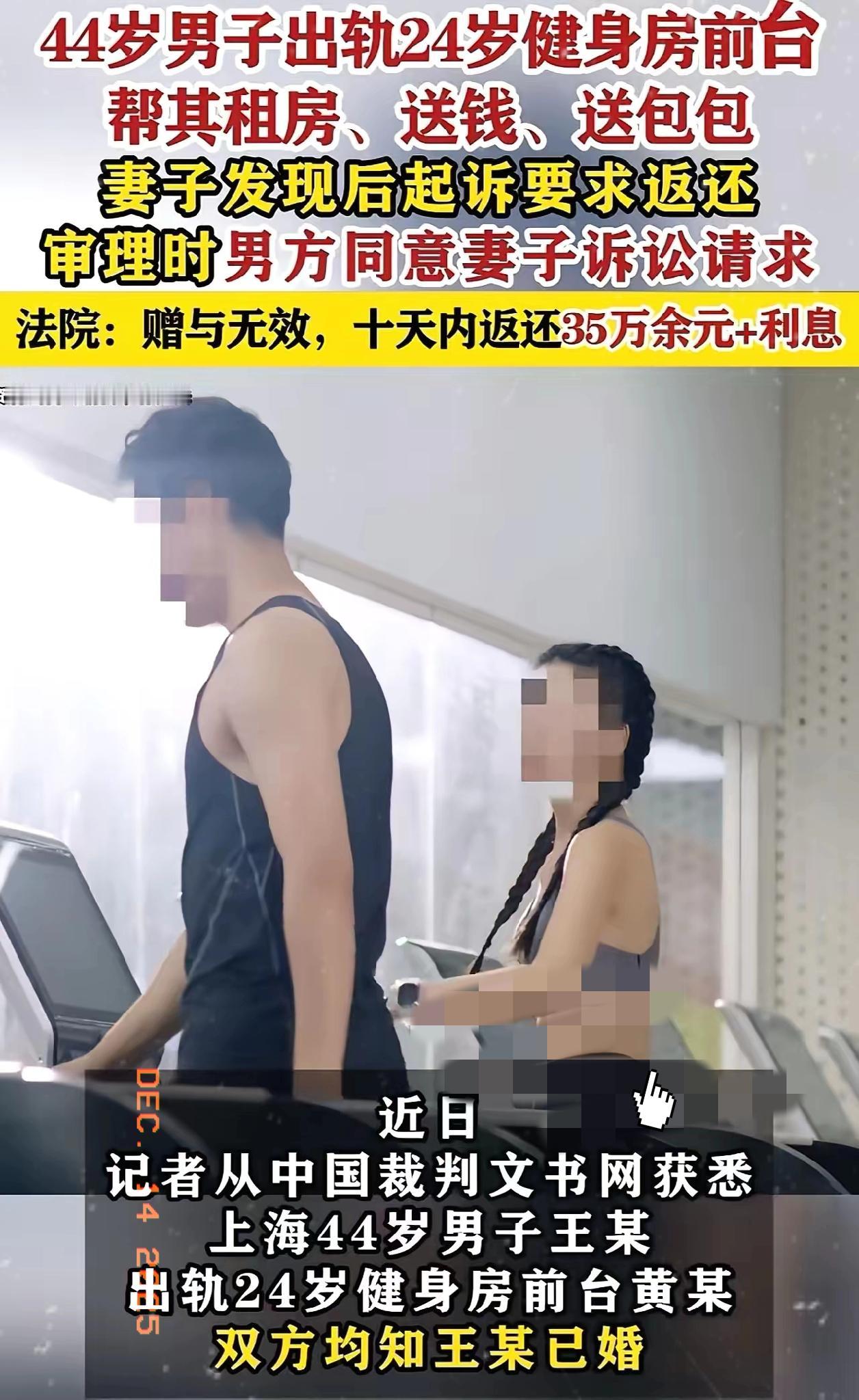 “这不是白嫖我吗?”上海黄浦,44岁男子与24岁健身房前台发展为情人关系,在外租房金屋藏娇,赠送钱财被妻子起诉!法院一审判决归还!网友:这是白嫖了姑娘!然后俩口子一合计就起诉这个姑娘把钱要回!小姑娘输的裤衩子都不剩! 看着是“白嫖”,实则是法律早给不正当关系划了红线。老王花的每一分钱都是夫妻共同财产,没经妻子同意的赠与,本身就违背公序良俗,法律根本不认可。 黄敏明知对方已婚还陷进去,以为能靠“情人关系”拿好处,却忘了这种依附他人的捷径,本质就是风险陷阱。更讽刺的是,她满心期待的“老公”,转头就成了指证她的关键证人。 法院判返还35万+利息,不是偏袒谁,而是在明确:破坏别人家庭的感情,连带着非法所得,都站不住脚。你觉得这事儿里,最该被指责的是哪一方?来评论区聊聊~
