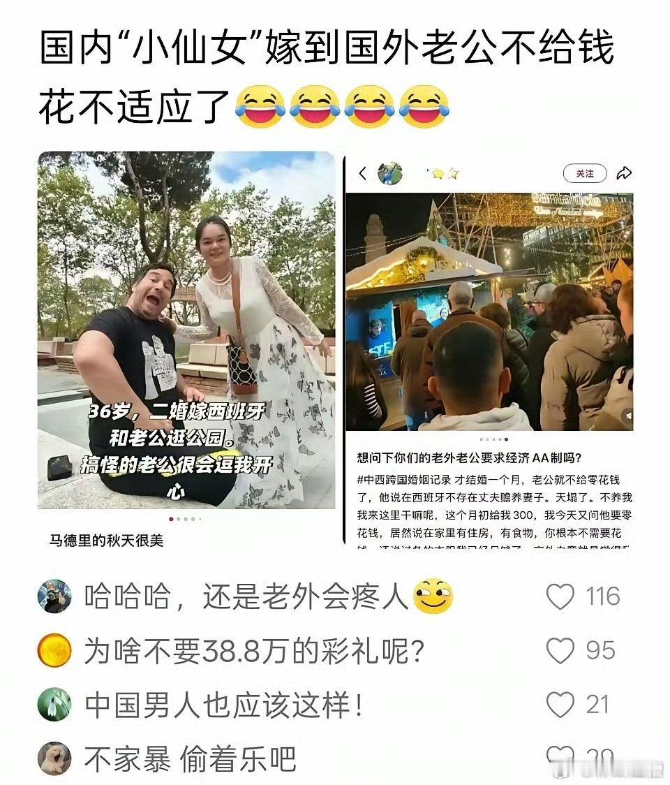 婚前:36岁,二婚嫁西班牙,老公好搞怪,好会逗我开心,好幸福婚后:老公不给我零花钱,不养我,那我来西班牙干嘛?小仙女不管去哪里,都会写小作文,只不过嫁到国外,写再多小作文,也不管用了